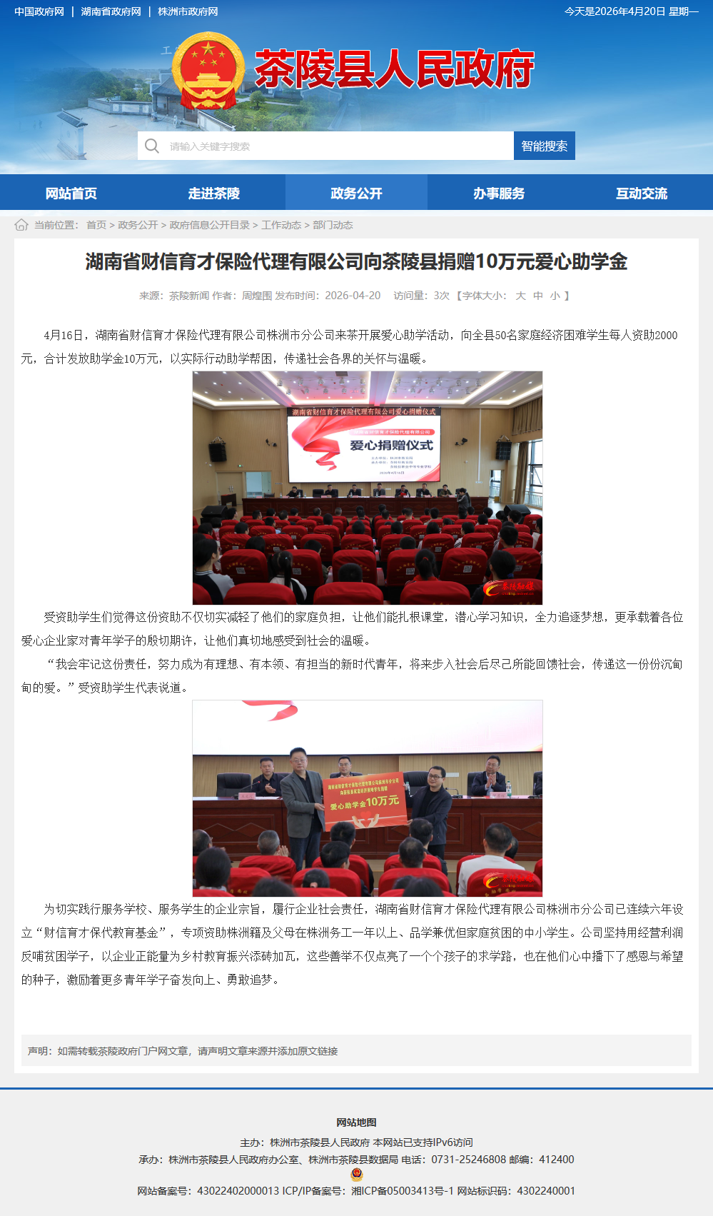 4月16日,湖南省财信育才保险代理有限公司株洲市分公司来茶开展爱心助学活动,向全县50名家庭经济困难学生每人资助2000元,合计发放助学金10万元,以实际行动助学帮困,传递社会各界的关怀与温暖。