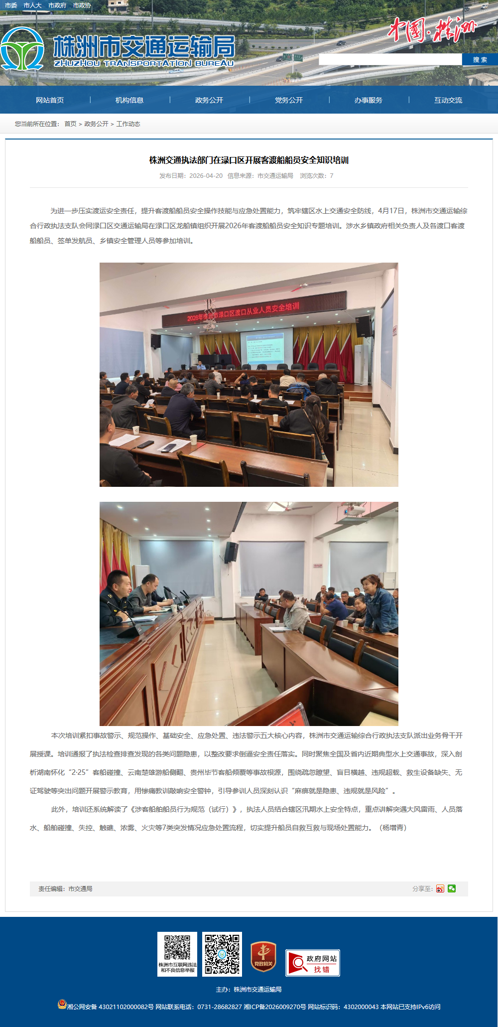 为进一步压实渡运安全责任,提升客渡船船员安全操作技能与应急处置能力,筑牢辖区水上交通安全防线,4月17日,株洲市交通运输综合行政执法支队会同渌口区交通运输局在渌口区龙船镇组织开展2026年客渡船船员安全知识专题培训。涉水乡镇政府相关负责人及各渡口客渡船船员、签单发航员、乡镇安全管理人员等参加培训。