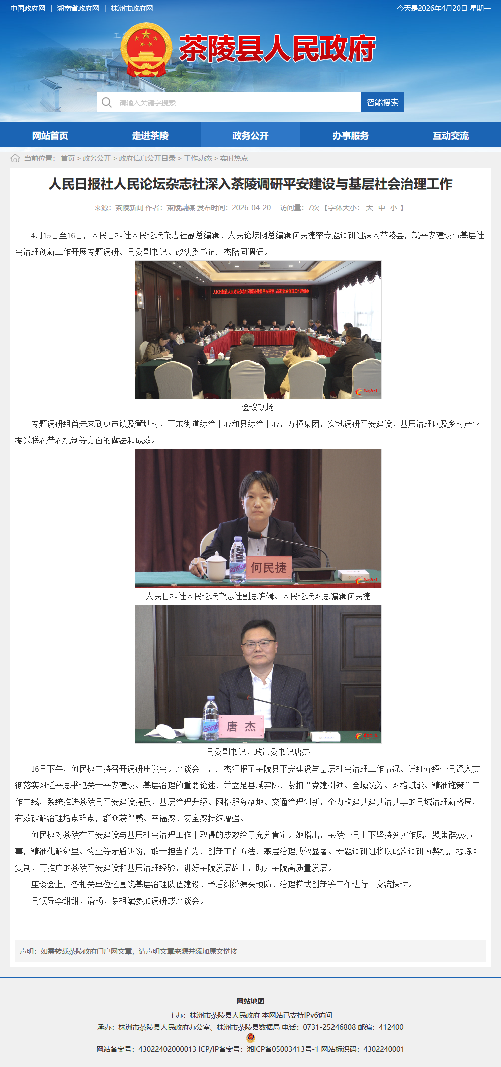 4月15日至16日,人民日报社人民论坛杂志社副总编辑、人民论坛网总编辑何民捷率专题调研组深入茶陵县,就平安建设与基层社会治理创新工作开展专题调研。县委副书记、政法委书记唐杰陪同调研。
