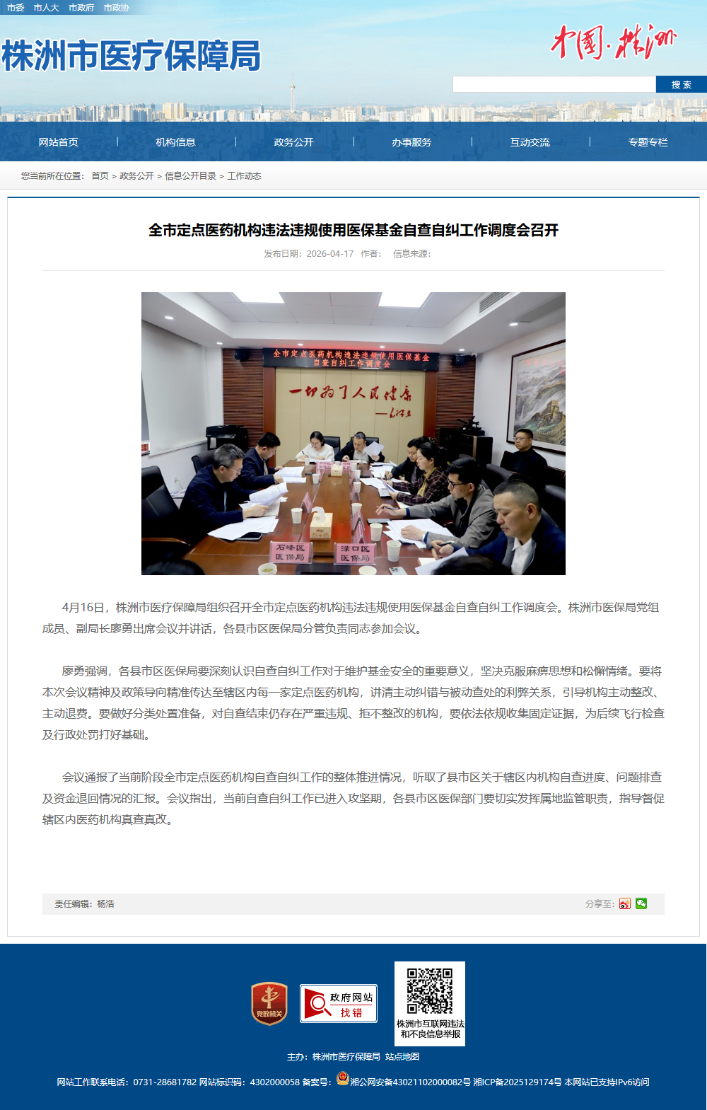 4月16日,株洲市医疗保障局组织召开全市定点医药机构违法违规使用医保基金自查自纠工作调度会。株洲市医保局党组成员、副局长廖勇出席会议并讲话,各县市区医保局分管负责同志参加会议。