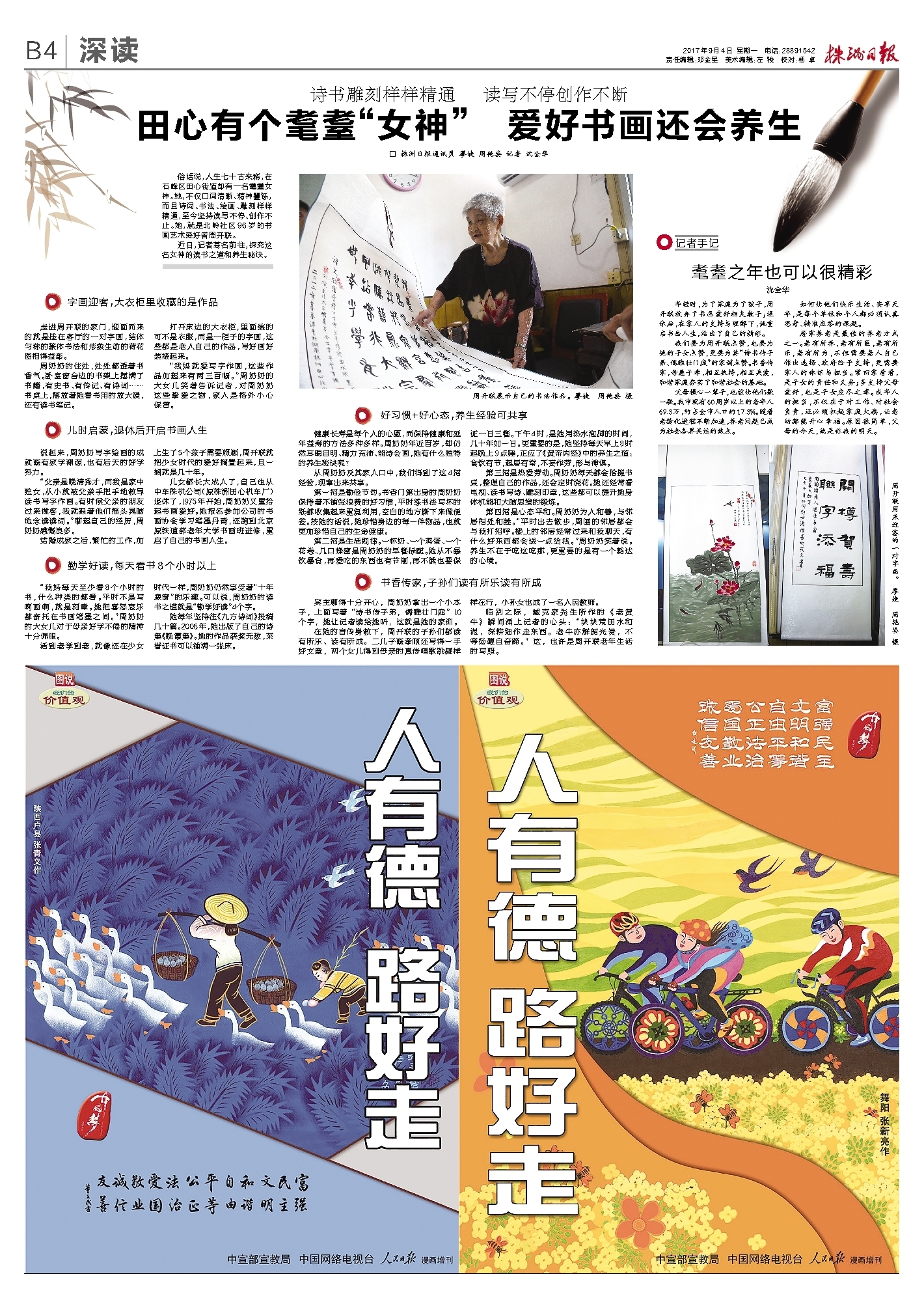 宾主聊得十分开心,周奶奶拿出一个小本子,上面写着“诗书传子弟,儒雅壮门庭”10个字,她让记者读给她听,这就是她的家训。