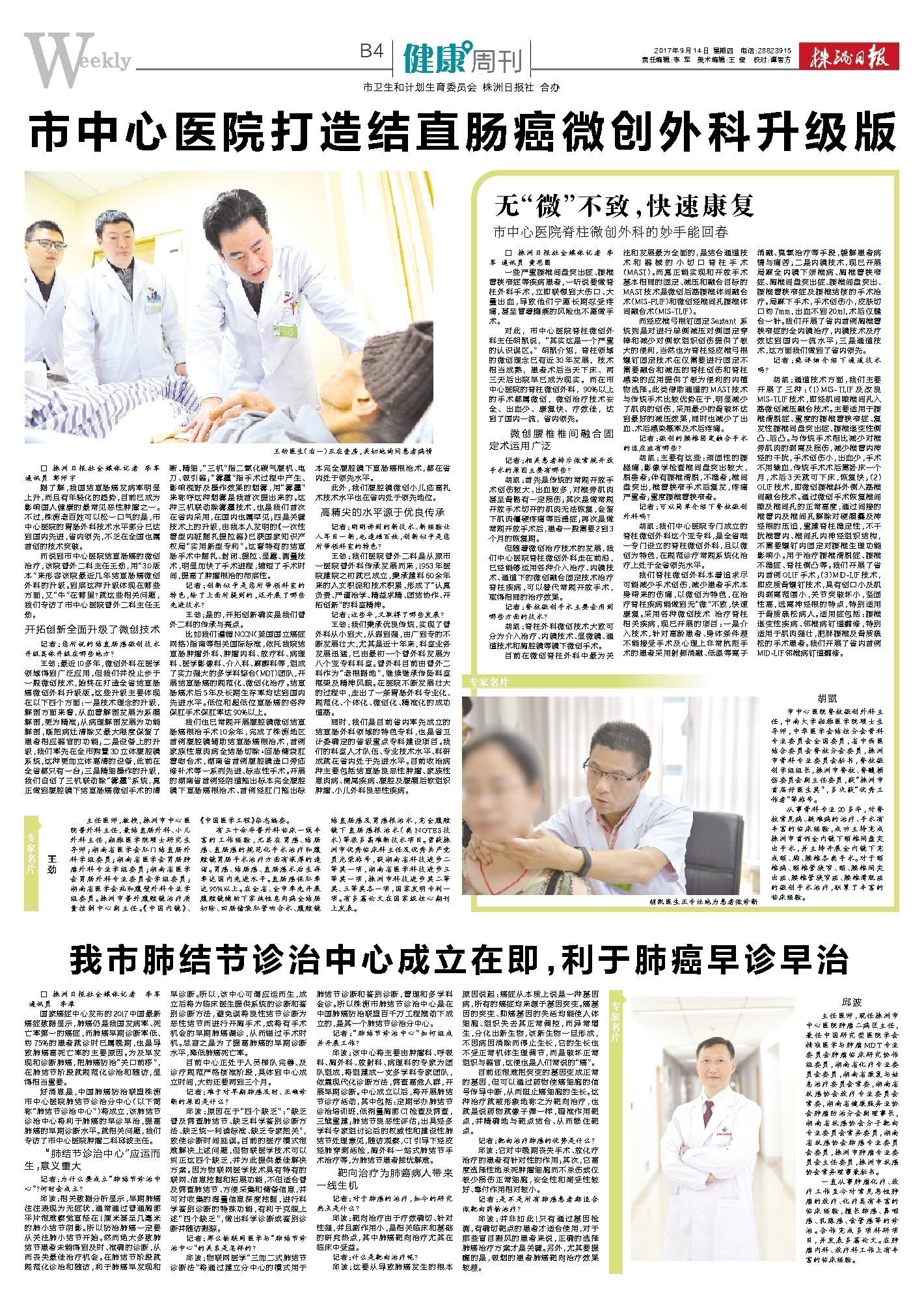 邱波:该中心将主要由肿瘤科、呼吸科、胸外科、放射科、病理科的专家为团队组成,将组建成一支多学科专家团队,依靠现代化诊断方法,筛查高危人群,开展早期诊断。中心成立以后,将开展肺结节诊疗活动,其中包括:定期举办肺结节诊治培训班,低剂量胸部CT检查及筛查,三维重建;肺结节良恶性评估;出具经多学科专家组讨论后的权威性和建设性肺结节处理意见,随访观察,CT引导下经皮经肺穿刺活检,胸外科一站式肺结节手术治疗等,为肺结节患者排忧解难。