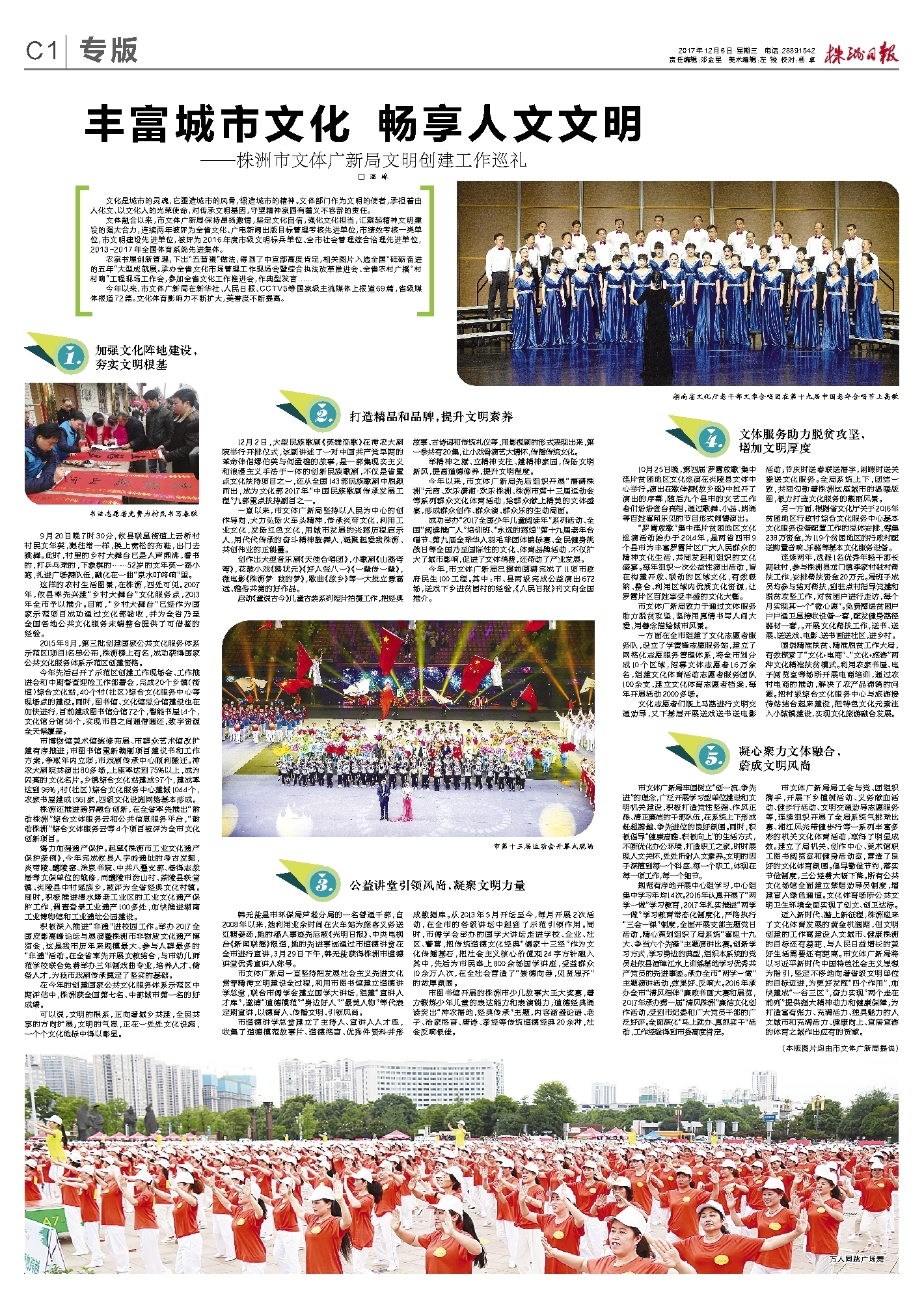今年以来,市文体广新局先后组织开展“福满株洲”元宵、欢乐潇湘·欢乐株洲、株洲市第十三届运动会等系列群众文化体育活动,给群众献上精美的文体盛宴,形成群众创作、群众演、群众乐的生动局面。