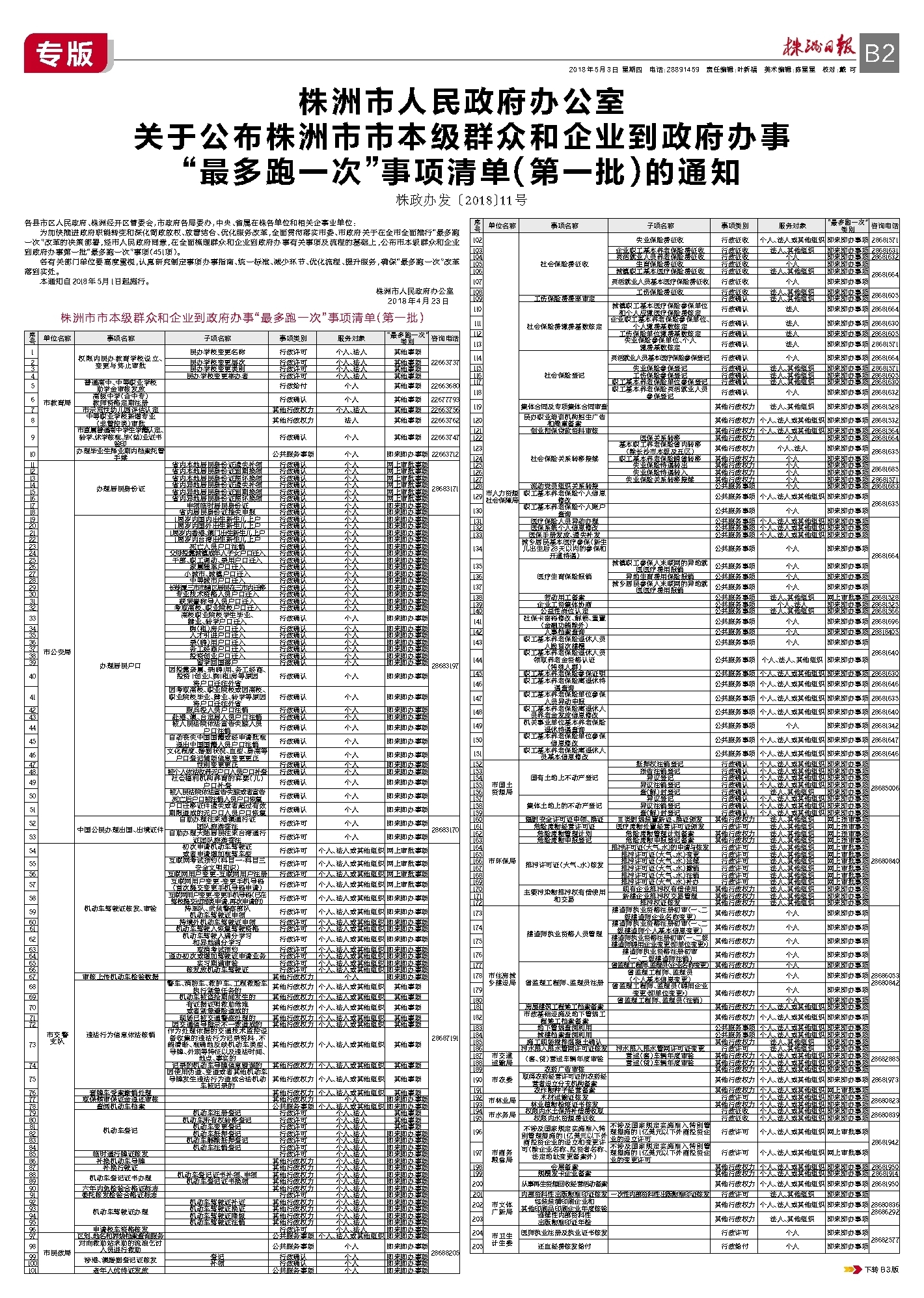 株洲市人民政府办公室 关于公布株洲市市本级群众和企业到政府办事 “最多跑一次”事项清单(第一批)的通知