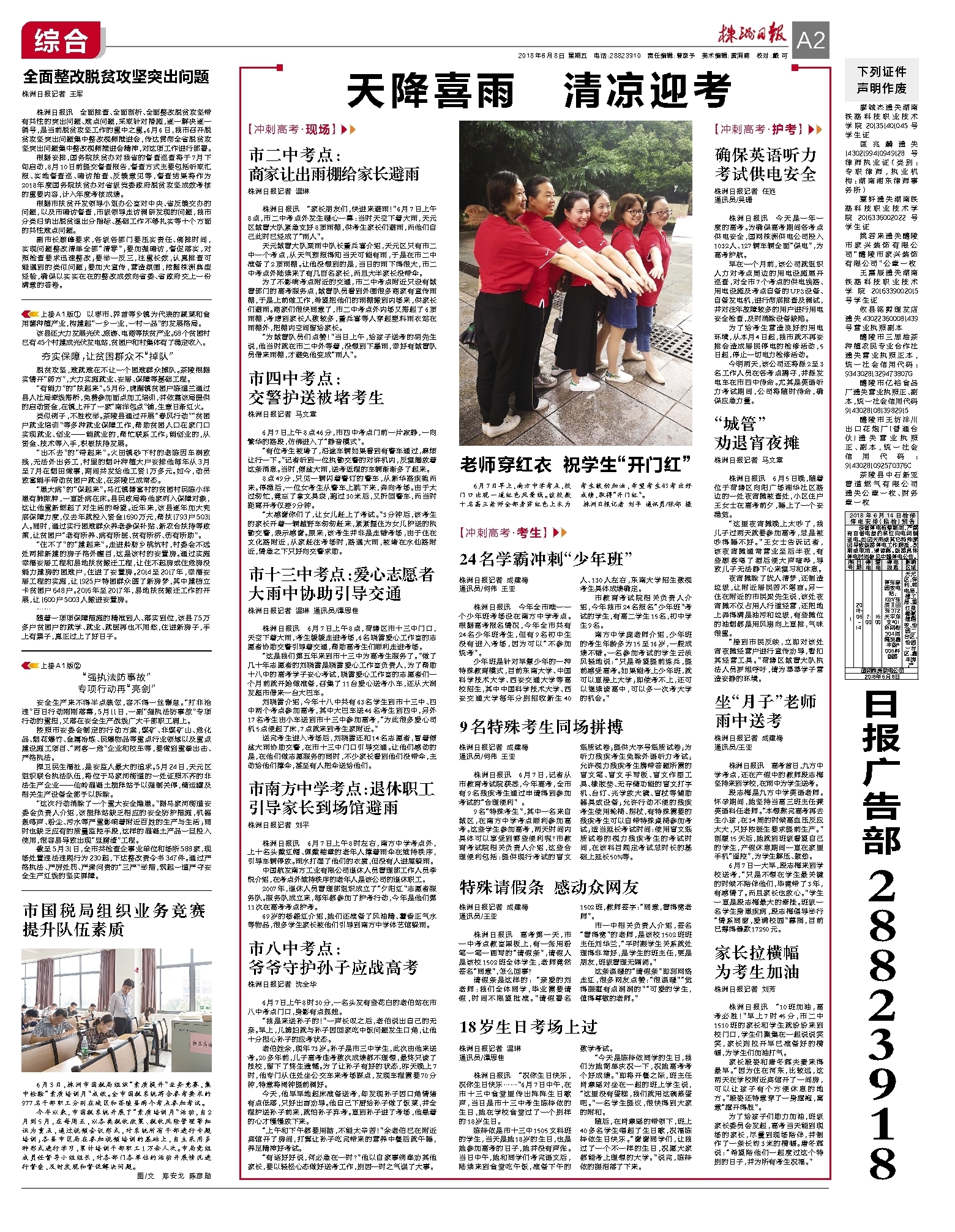 株洲日报讯 6月7日上午8时左右,南方中学考点外,上十名头戴红帽、佩戴袖章的老年人撑着雨伞在维持秩序,引导车辆停放。雨水打湿了他们的衣裳,但没有人进屋躲雨。