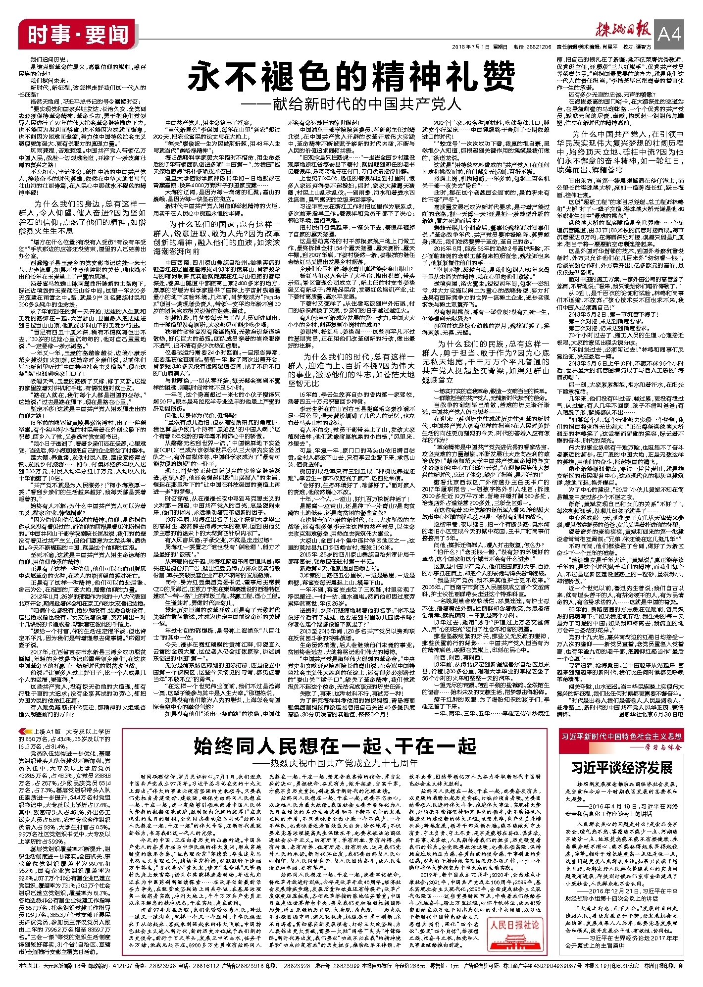 回首97年发展历程,我们党紧紧依靠人民,跨过一道又一道沟坎,取得一个又一个胜利,中华民族迎来了从站起来、富起来到强起来的伟大飞跃。中国特色社会主义进入新时代,新的历史方位赋予我们新的历史使命。前行于百尺竿头,发展正中流击水,任务千头万绪,挑战无处不在。8900多万党员唯有始终同人民想在一起、干在一起,坚定舍我其谁的信念、勇当尖兵的决心,勇担使命、奋发有为,做开拓者、当实干家,才能不负历史重托,创造属于新时代的光辉业绩。