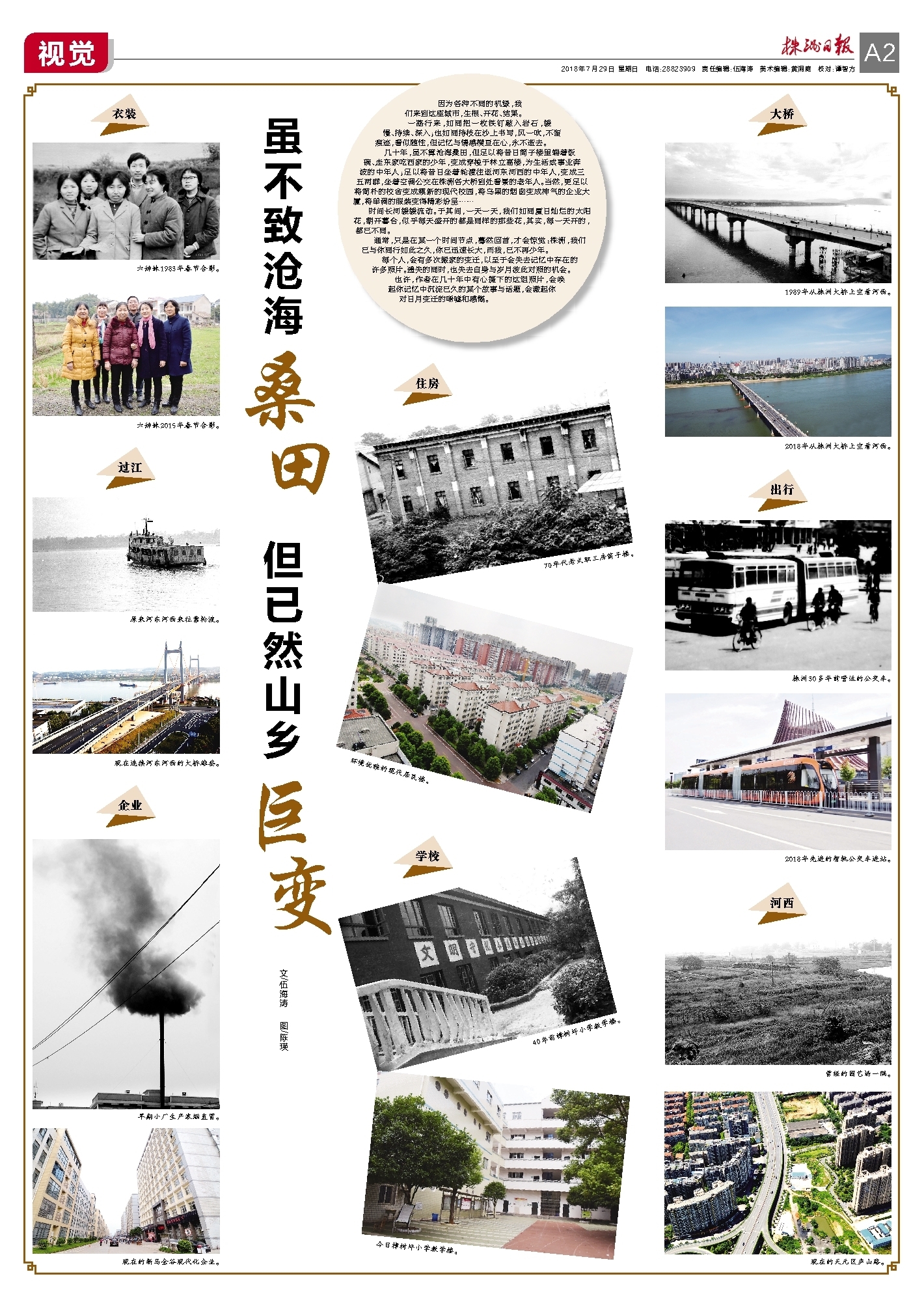 几十年,虽不算沧海桑田,但足以将昔日筒子楼里端着饭碗、走东家吃西家的少年,变成穿梭于林立高楼,为生活或事业奔波的中年人;足以将昔日坐着轮渡往返河东河西的中年人,变成三五两群,坐着空调公交在株洲各大桥到处看景的老年人。当然,更足以将简朴的校舍变成簇新的现代校园,将乌黑的烟囱变成神气的企业大厦,将单调的服装变得精彩纷呈……