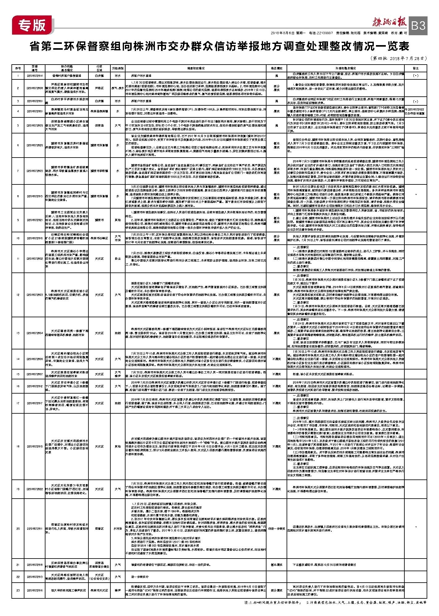 省第二环保督察组向株洲市交办群众信访举报地方调查处理整改情况一览表