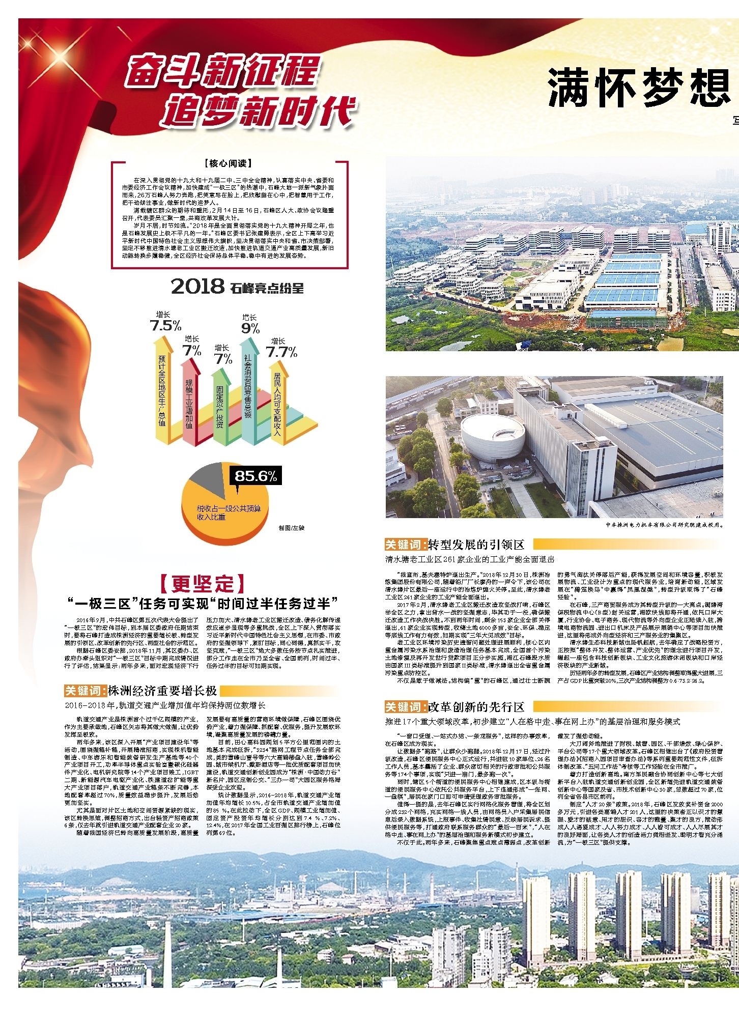 岁月不居,时节如流。“2018年是全面贯彻落实党的十九大精神开局之年,也是石峰发展史上极不平凡的一年。”石峰区委书记张建勇表示,全区上下高举习近平新时代中国特色社会主义思想伟大旗帜,坚决贯彻落实中央和省、市决策部署,坚定不移推进清水塘老工业区搬迁改造,加快推进轨道交通产业高质量发展,新旧动能转换步履稳健,全区经济社会保持总体平稳、稳中有进的发展态势。