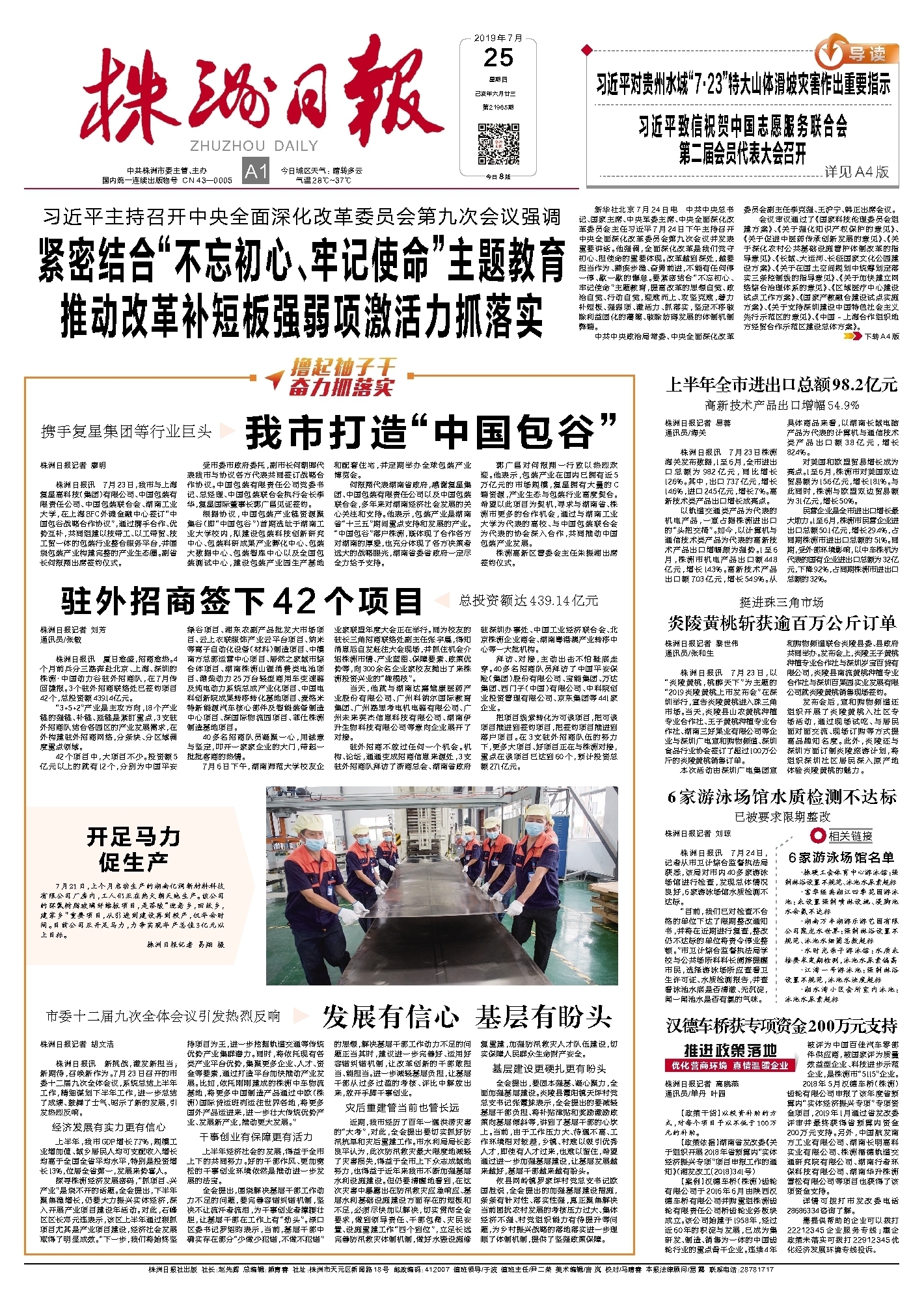 新华社北京7月24日电 中共中央总书记、国家主席、中央军委主席、中央全面深化改革委员会主任习近平7月24日下午主持召开中央全面深化改革委员会第九次会议并发表重要讲话。他强调,全面深化改革是我们党守初心、担使命的重要体现。改革越到深处,越要担当作为、蹄疾步稳、奋勇前进,不能有任何停一停、歇一歇的懈怠。要紧密结合“不忘初心、牢记使命”主题教育,提高改革的思想自觉、政治自觉、行动自觉,迎难而上、攻坚克难,着力补短板、强弱项、激活力、抓落实,坚定不移破除利益固化的藩篱、破除妨碍发展的体制机制弊端。