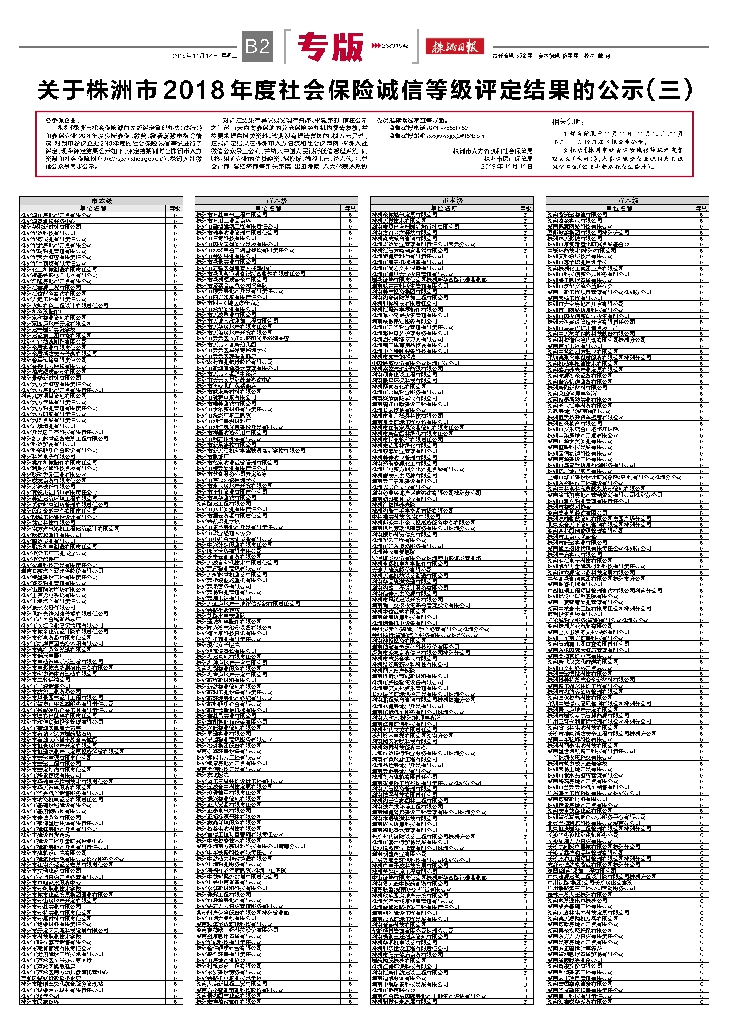 关于株洲市2018年度社会保险诚信等级评定结果的公示(三)