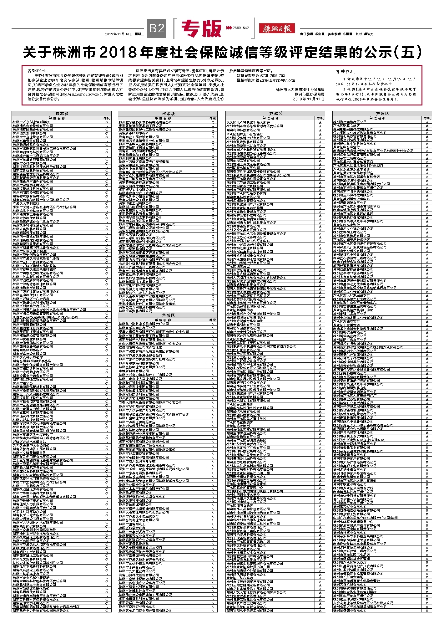 关于株洲市2018年度社会保险诚信等级评定结果的公示(五)