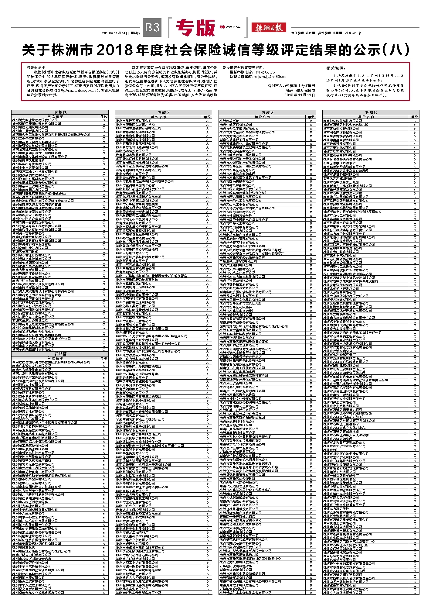 关于株洲市2018年度社会保险诚信等级评定结果的公示(八)