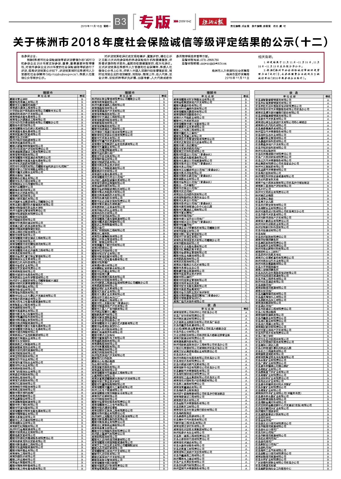 关于株洲市2018年度社会保险诚信等级评定结果的公示(十二)
