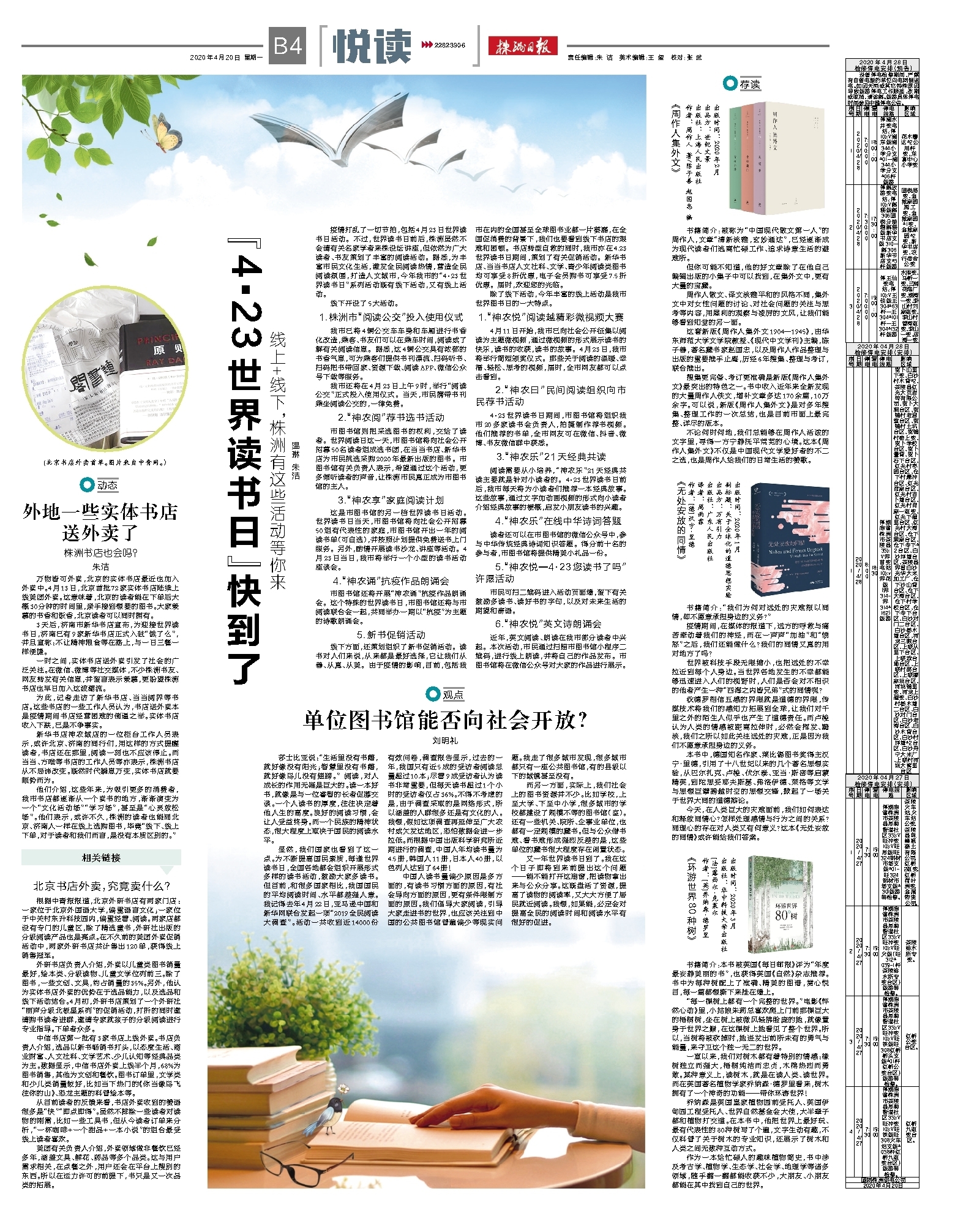 中信书店第一批有3家书店上线外卖。书店负责人介绍,选品以新书畅销书打头,以态度生活、商业财富、人文社科、文学艺术、少儿认知等经典品类为主。数据显示,中信书店外卖上线半个月,68%为图书销售,其他为文创和餐饮。图书订单里,文学类和少儿类销量较好,比如当下热门的《你当像鸟飞往你的山》、恐龙主题的科普绘本等。