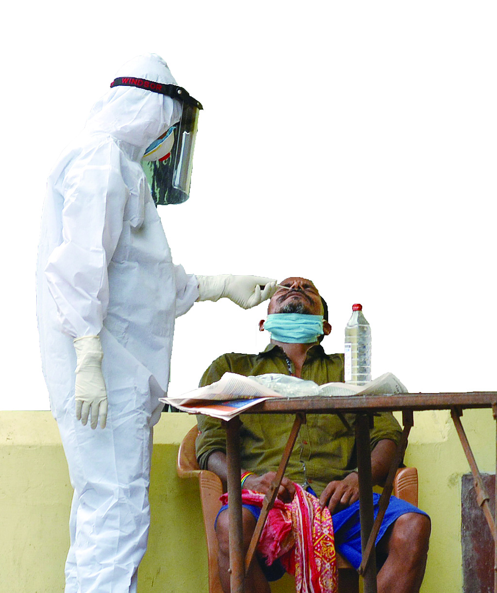 18日,在印度高哈蒂,医生为一名男子进行新冠病毒检测采样。