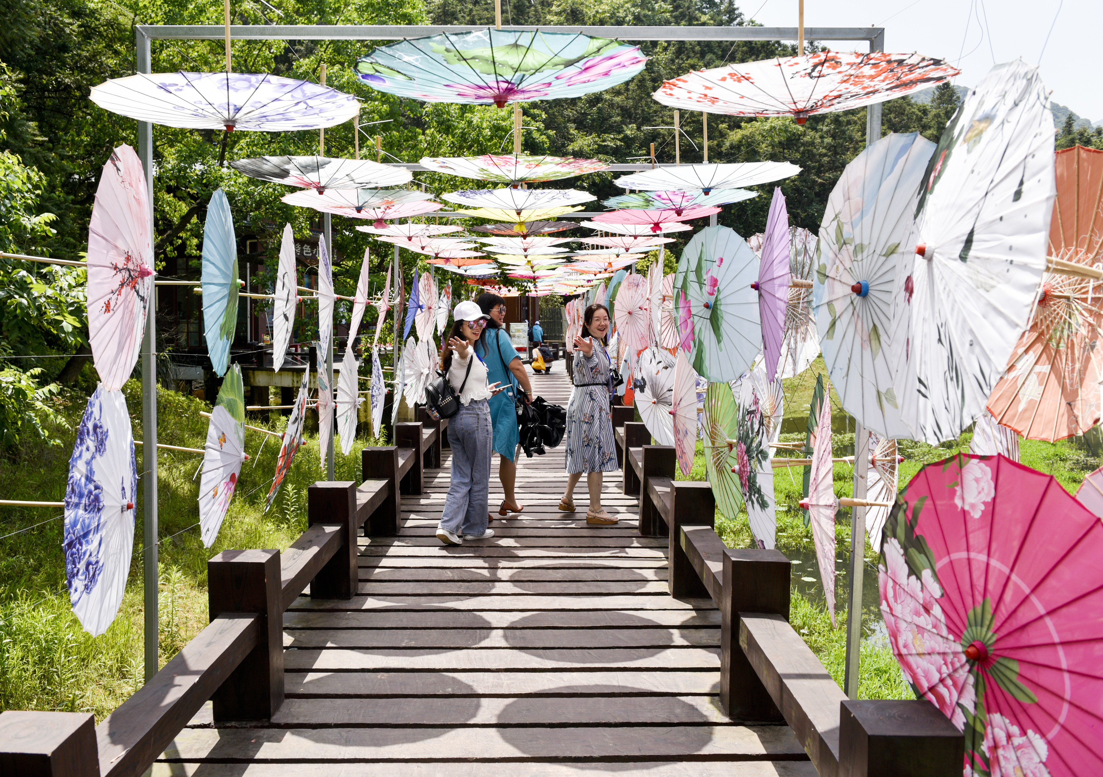 游客们从一座挂满了油纸伞的木桥上走过。 刘震 摄