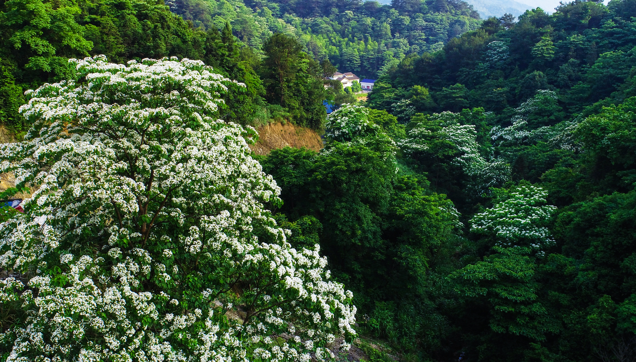 在酒仙湖景区内,一片片雪白的油桐花正值盛开旺季。 李茂春 摄
