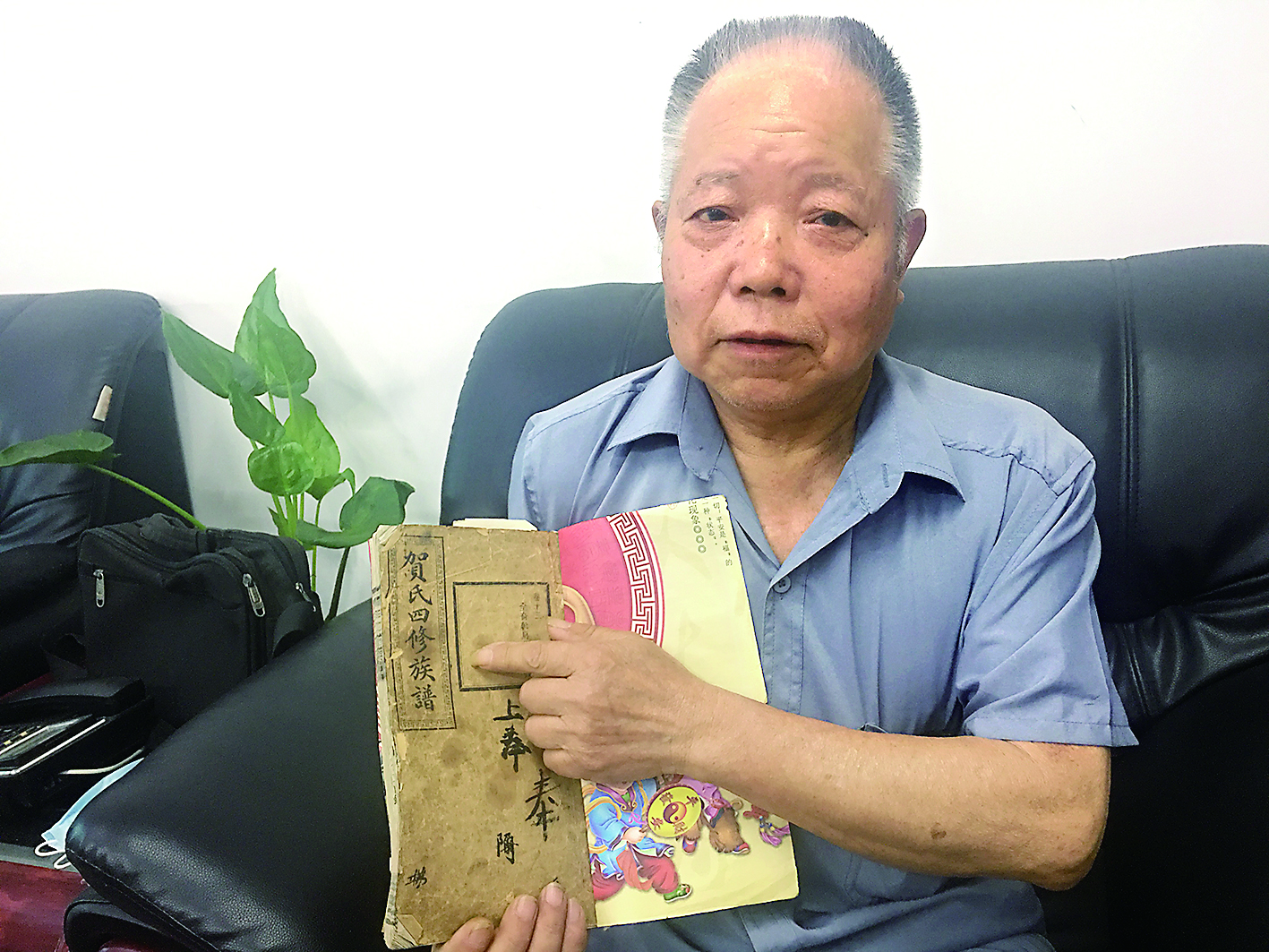 贺仁斌向记者展示贺氏家谱。 株洲日报记者 俞强年 摄