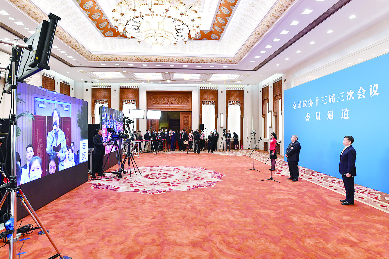 5月27日,在北京人民大会堂新闻发布厅举行全国政协十三届三次会议第三场“委员通道”采访活动。全国政协委员通过网络视频方式接受媒体采访。 新华社记者 李鑫 摄