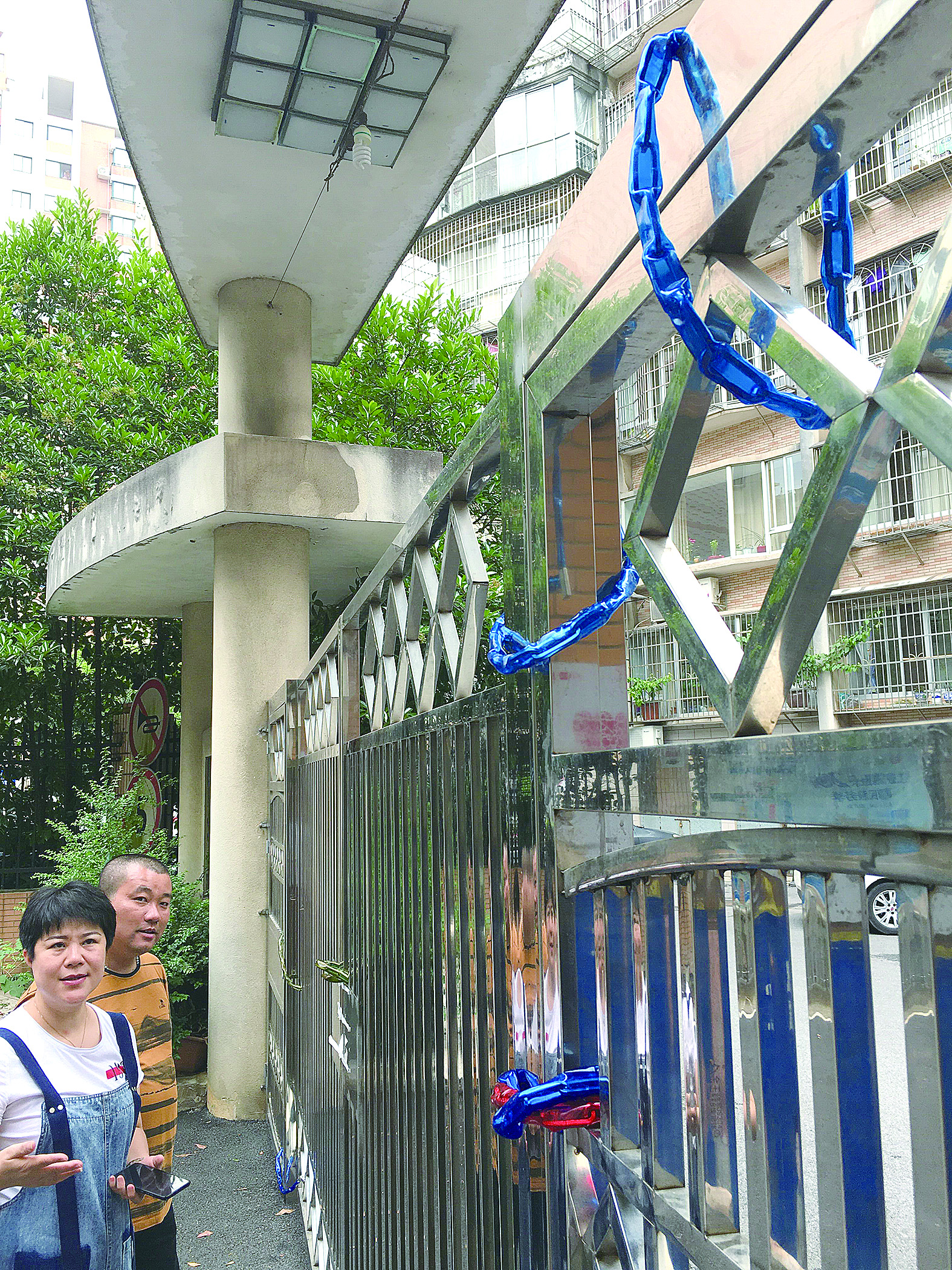 接到居民求助后,记者前往现场进行核实发现,铁门位于两小区之间,自疫情发生后,为加强疫情防控,铁门进行了封闭。5月25日一早,有花园一村小区居民砸开锁将铁门打开,但随后就有白鹤园小区的居民用了8把链锁将铁门锁住。