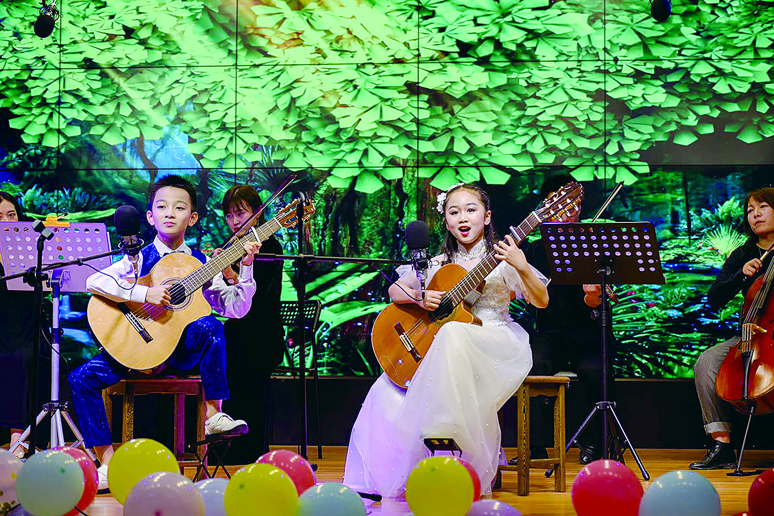 10个节目在该校七彩阳光剧场先后登场,既有欢乐明快的歌舞《天天向上》、温婉悠扬的表演唱《沧海一声笑》与《水调歌头》,又有韵味十足的小组唱《下山》《星辰大海》、清晰明丽的自弹自唱《山楂树》,更有歌声清澈、舞姿优雅的歌伴舞《声声慢》《我是一只小小鸟》……小朋友个性飞扬的艺术才华,让家长、老师惊叹不已,直播平台上加油、点赞的留言此起彼伏,将比赛氛围一次次推向高潮。