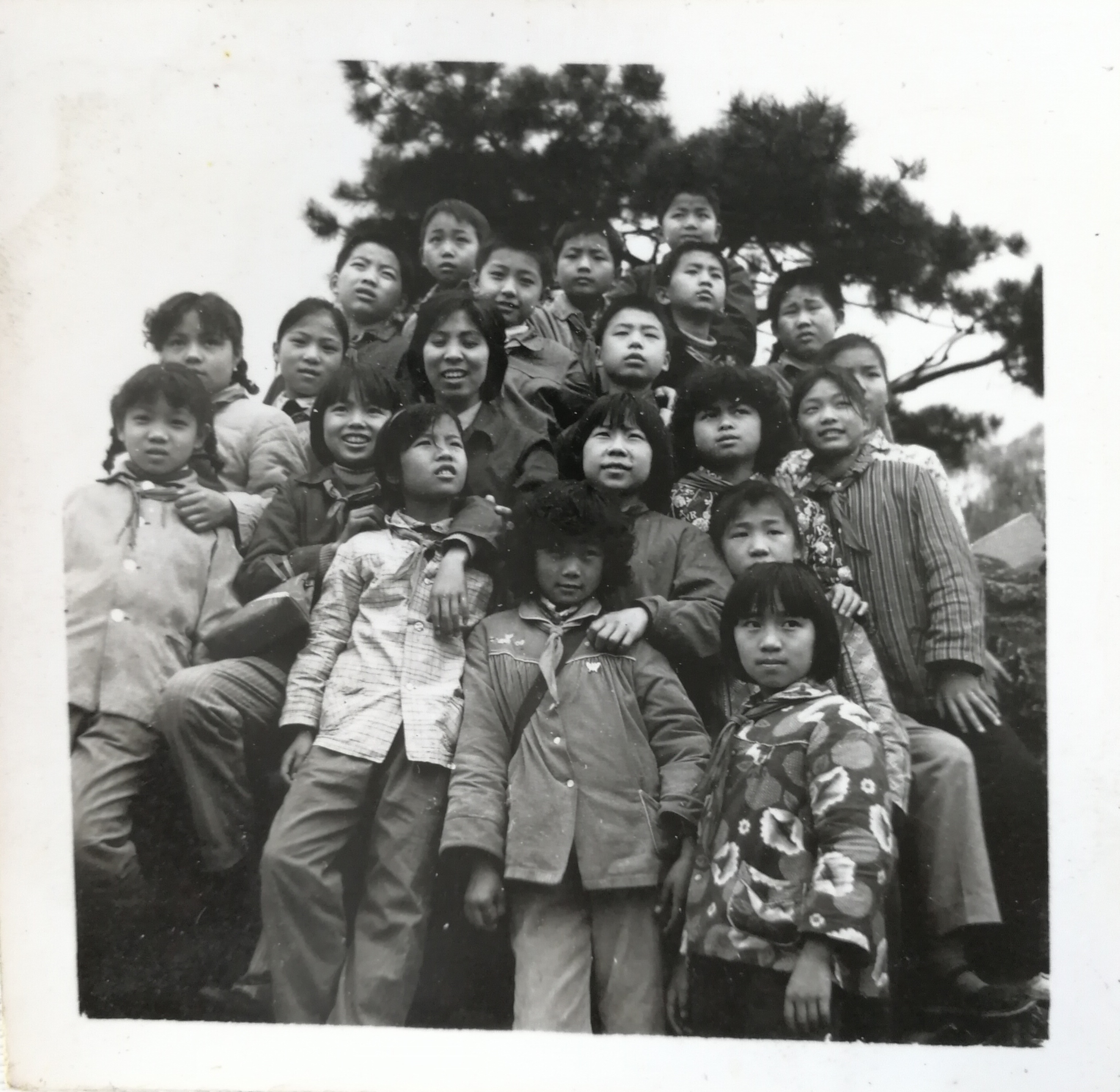 照片摄于1981年早春时节,是37班同学在小学阶段仅有的四张集体照之一,拍摄者是班主任廖老师。他用的是120相机,拍出的照片呈正方形。当时老师组织37班同学去长沙游玩,照片镜头推得比较近,背景为一棵松树,女生居前,男生居后,排列的形式轻松活泼,照片中间低头看学生的女老师,是教数学的柒老师。那个时候,小学生能到长沙游玩,并能拍照留念,是一件很荣幸的事。