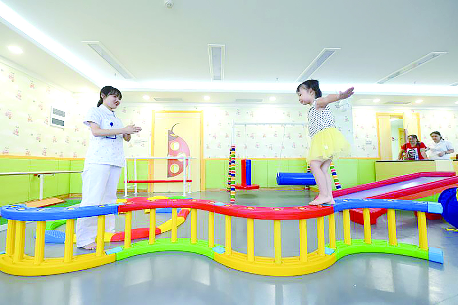儿保科医务人员对孩子进行有针对性的平衡训练。