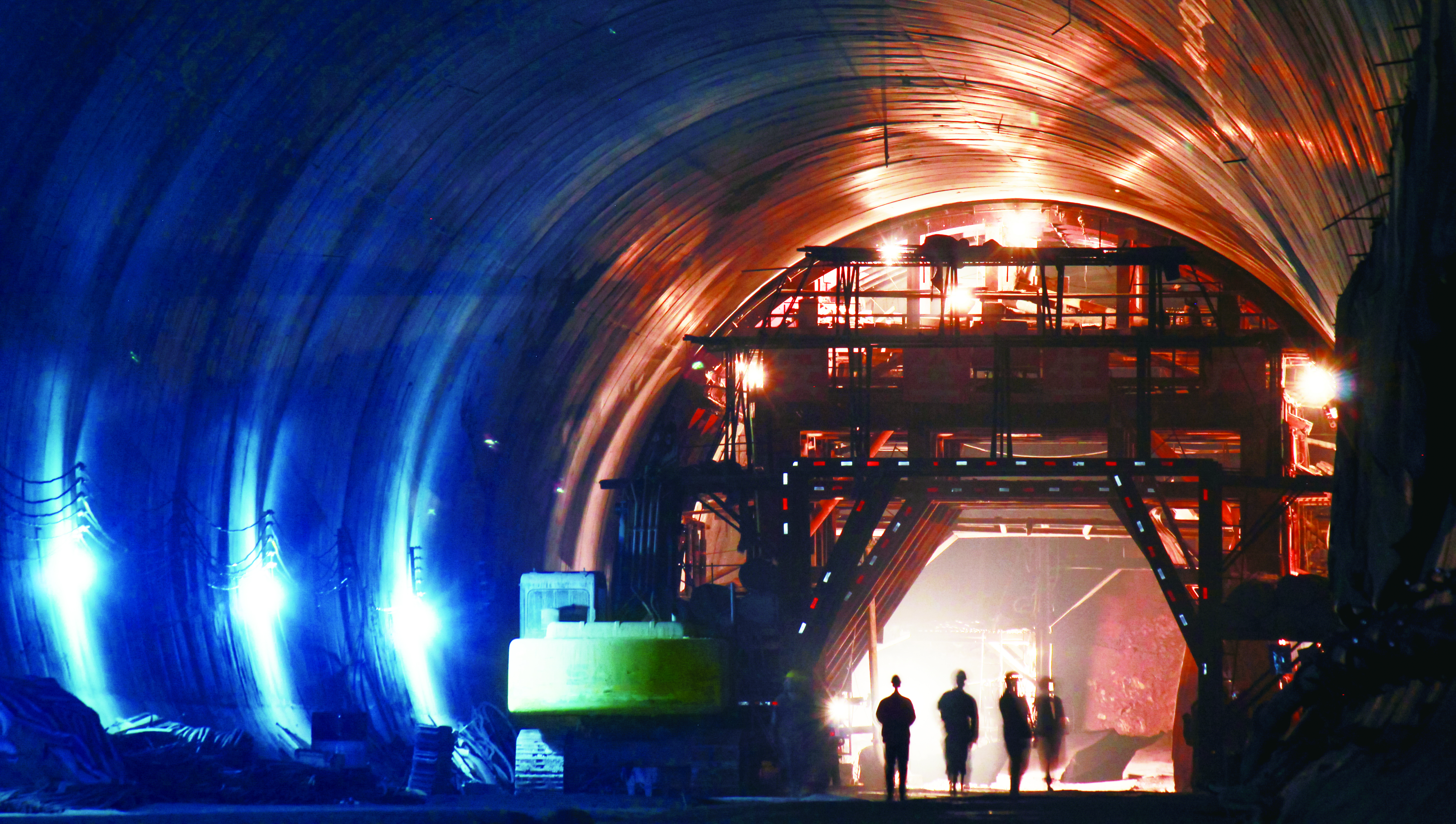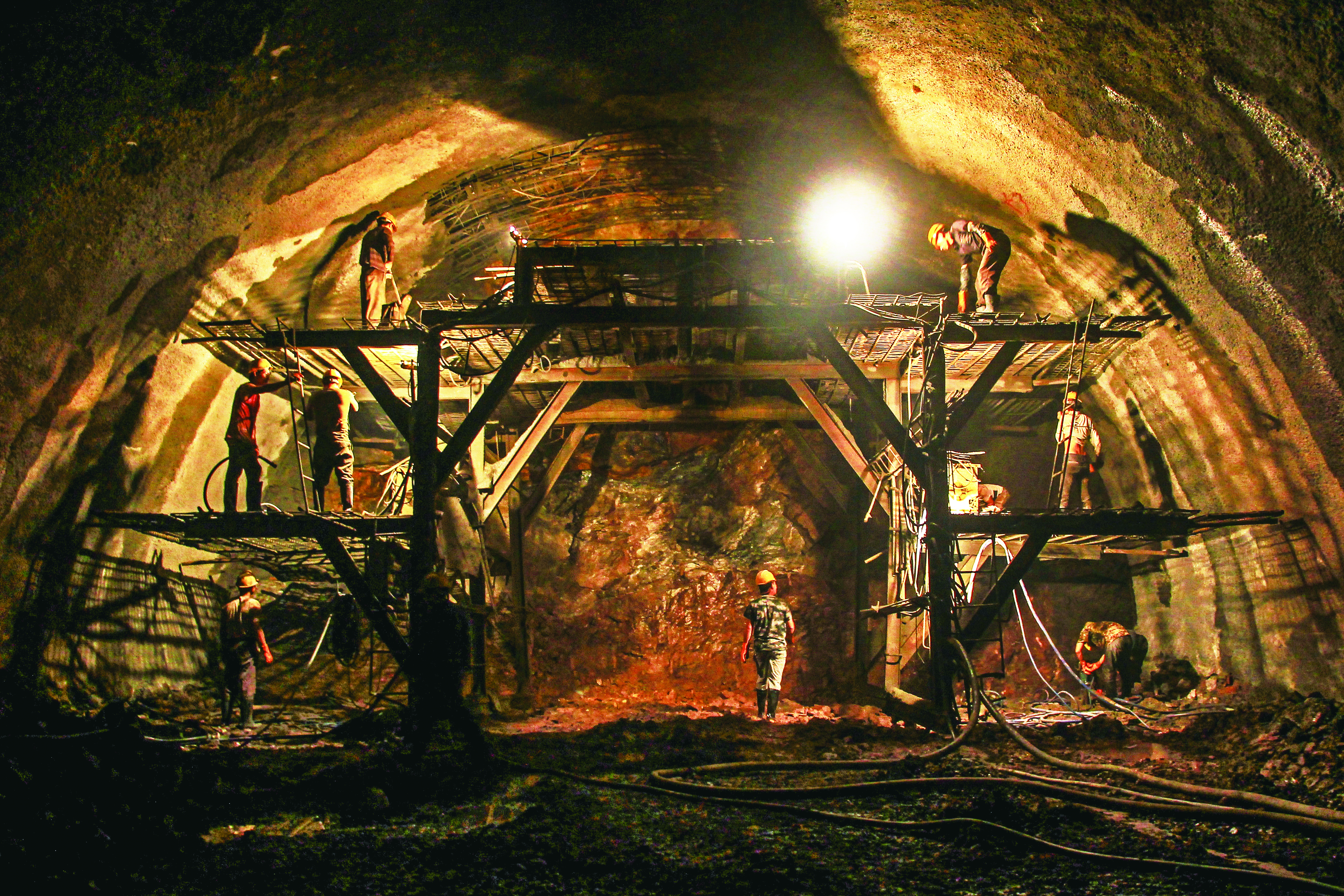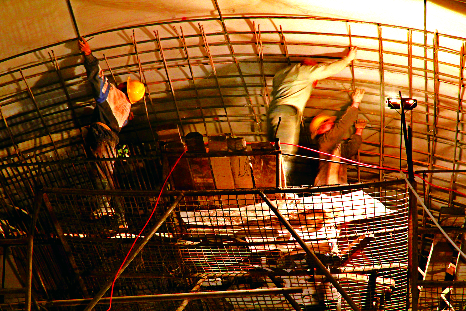2013年1月16日,工人正在隧道顶部架设钢筋。