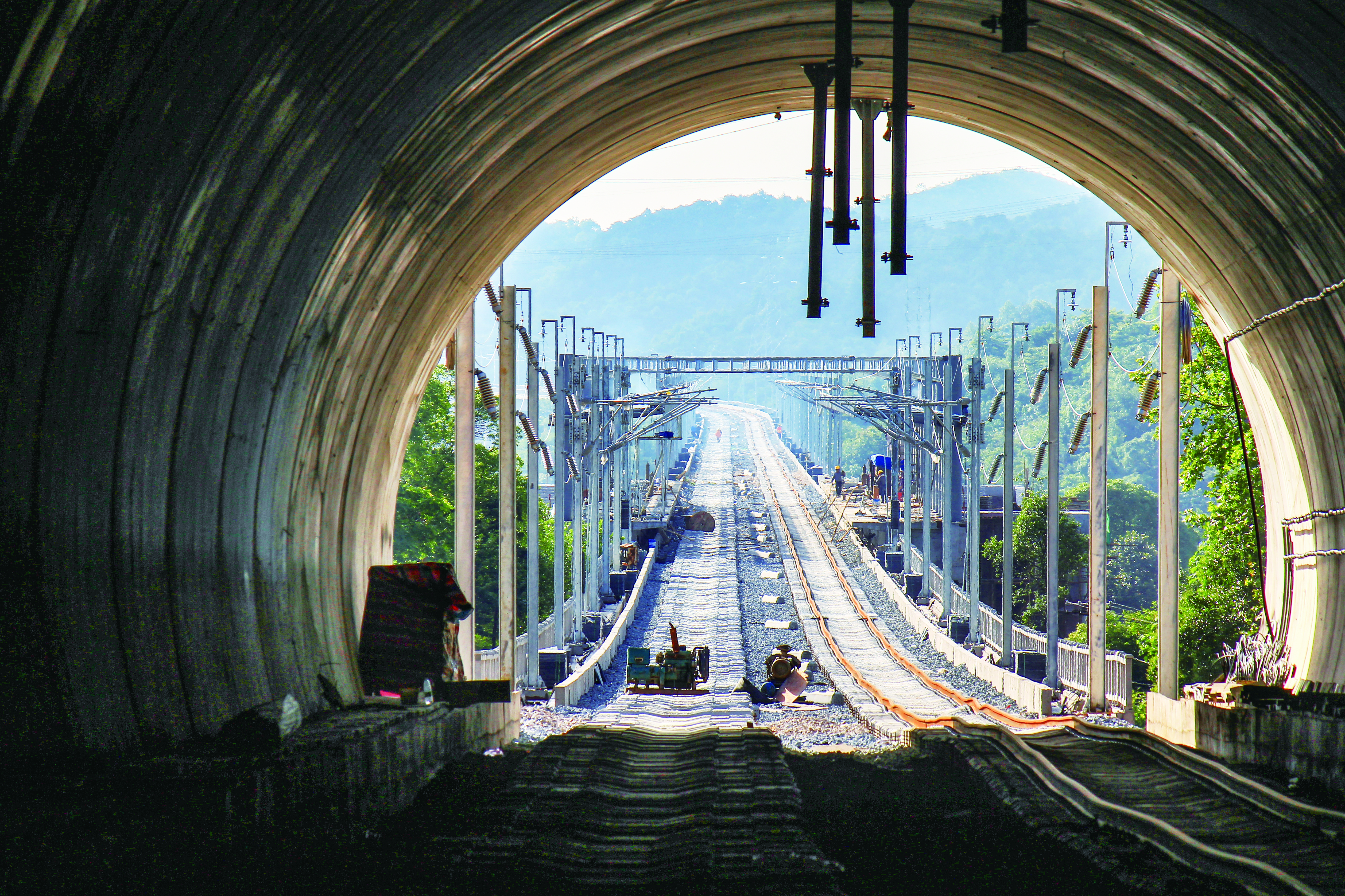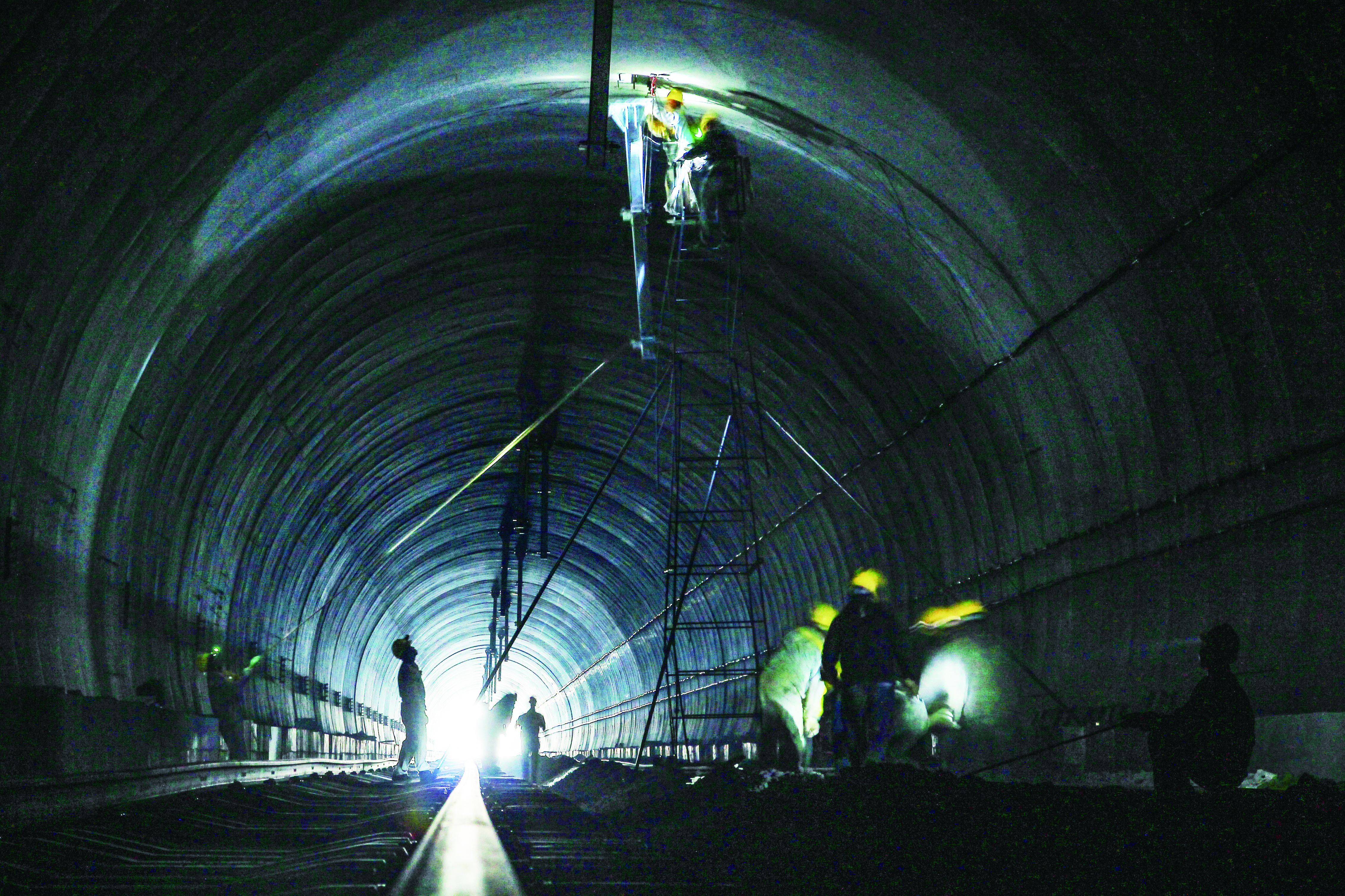 2016年5月28日,在隧道顶端安装电线支架。