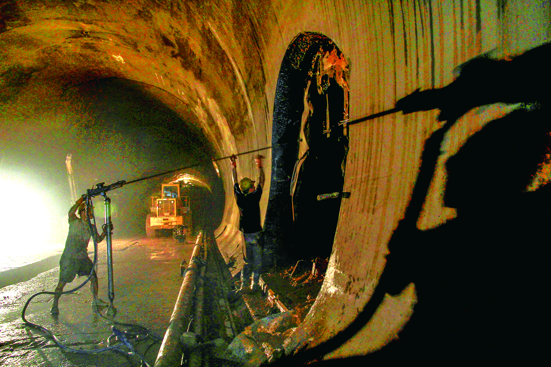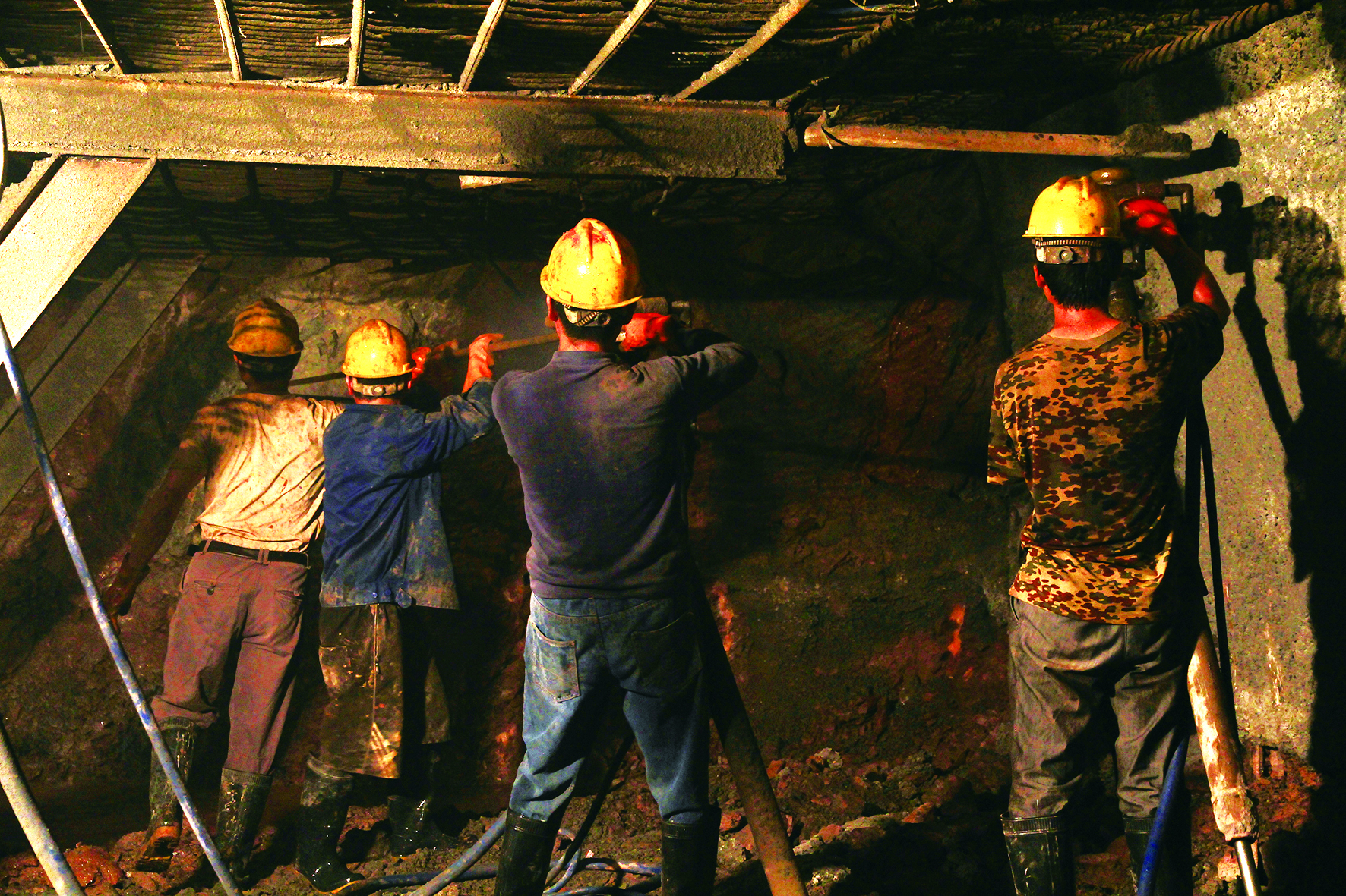 2012年6月9日,风炮机打孔是两人一队,一个掌控机器,一人掌控钻杆。