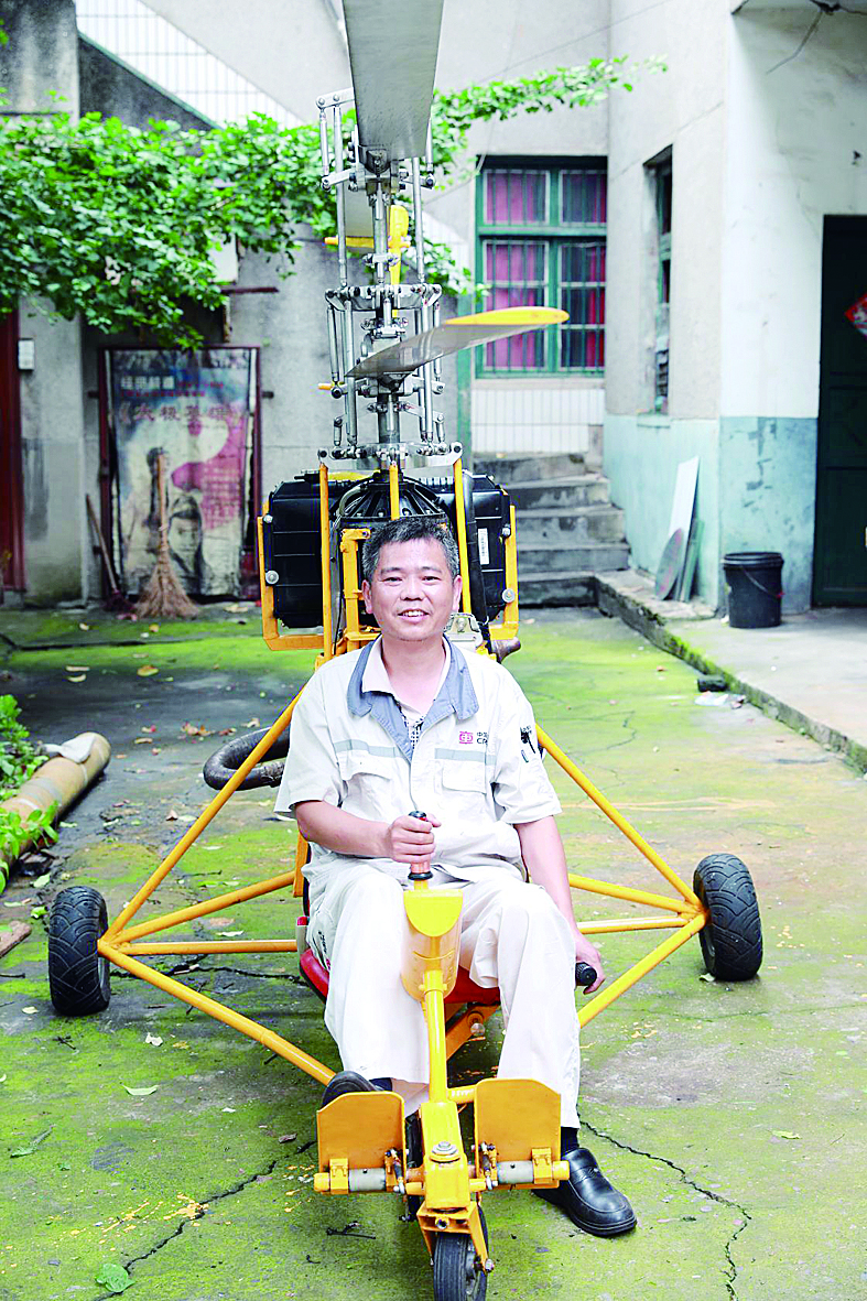 ▲郭武春和他研制的轻型直升机。通讯员 供图