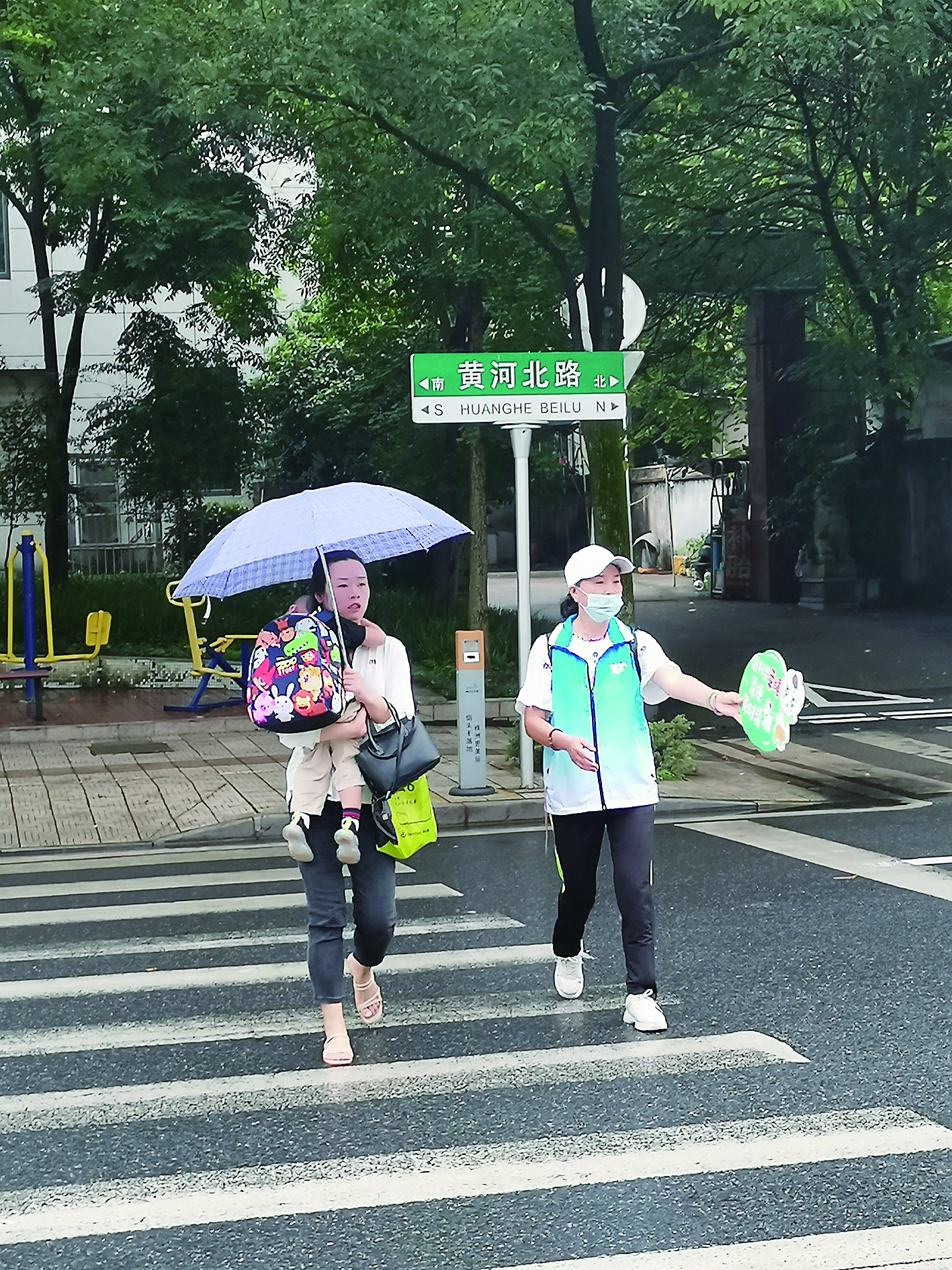 志愿者护送抱小孩的女市民过斑马线。 受访者 供图