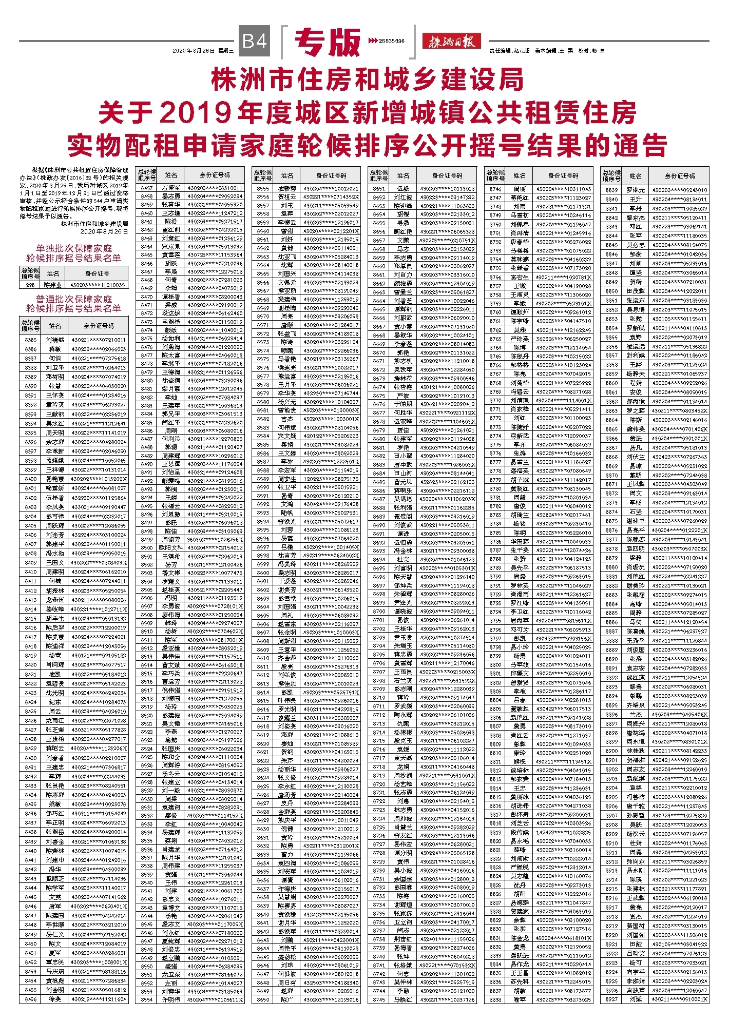 根据《株洲市公共租赁住房保障管理办法》(株政办发〔2016〕32号)的相关规定,2020年8月25日,我局对城区2019年1月1日至2019年12月31日已通过资格审核,并经公示符合条件的544户申请实物配租家庭进行轮候排序公开摇号,现将摇号结果予以通告。