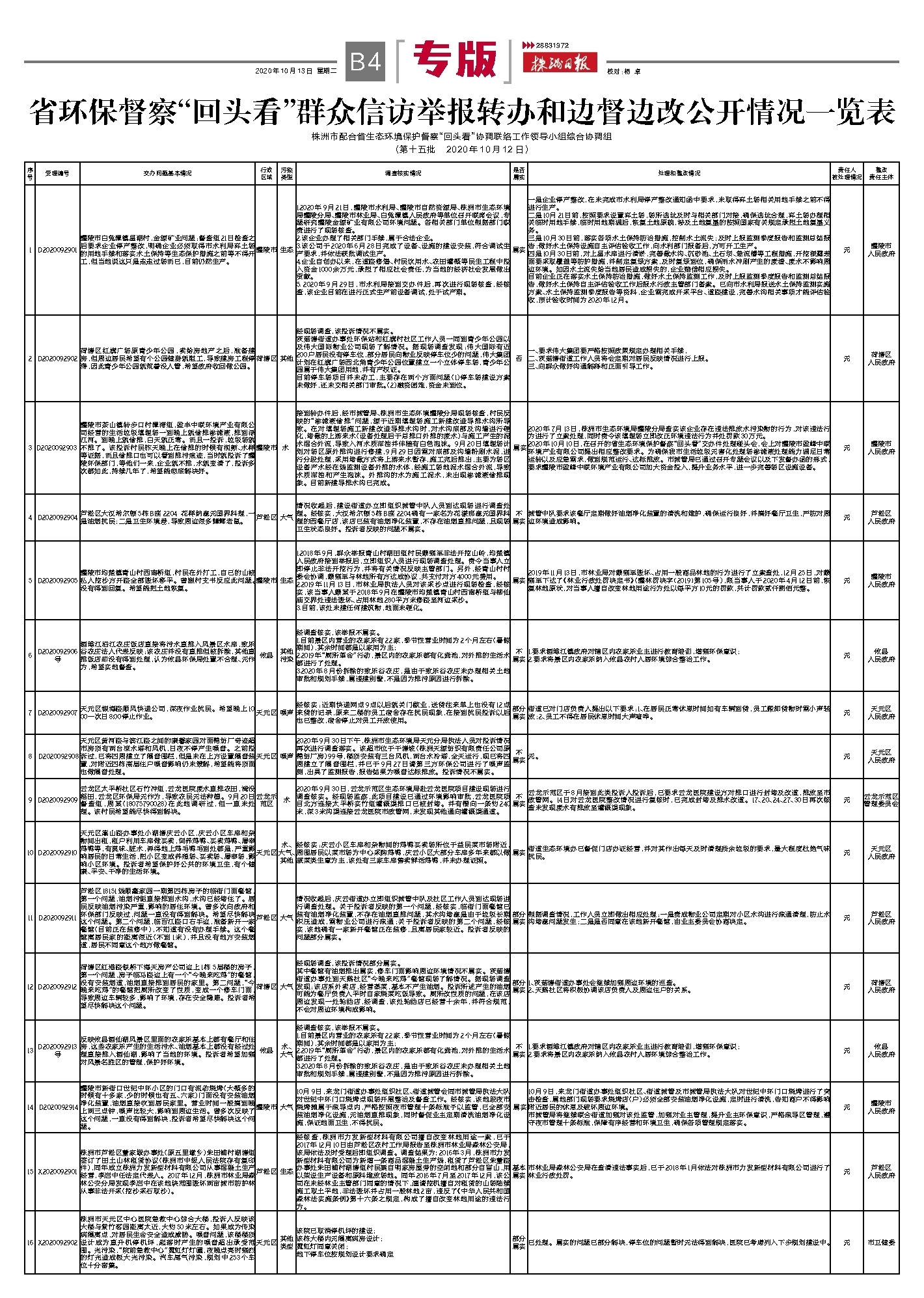 序号受理编号交办问题基本情况行政区域污染类型调查核实情况是否属实处理和整改情况 责任人