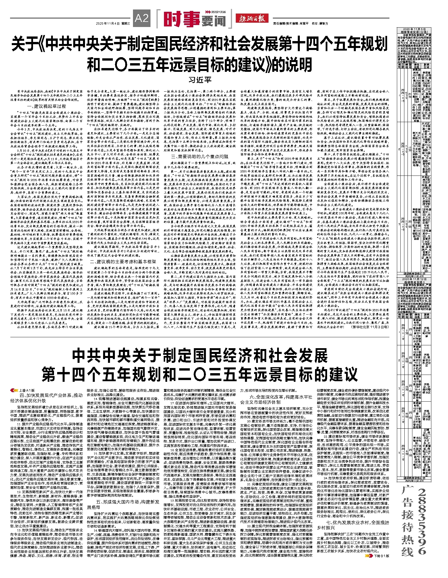 同志们!审议通过“十四五”规划和2035年远景目标建议,是这次全会的主要任务。大家要认真思考、深入讨论,提出建设性意见和建议,制定出一份高水平的规划建议。让我们同心协力、集思广益,共同把这次全会开好! (新华社北京11月3日电)