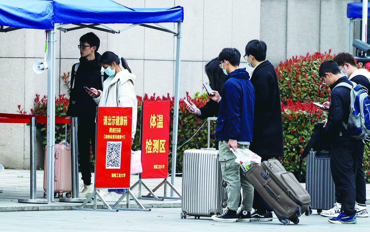 2月27日,湖南工业大学学生在出示有效健康绿码和“完美校园小程序返校审批通过界面”并测量体温后,有序返校。据悉,全体学生分三批次错峰错时返校,返校前14天须按学校要求进行健康打卡,发生本土病例城市的低风险地区学生,凭7天内核酸检测阴性证明方可返校。