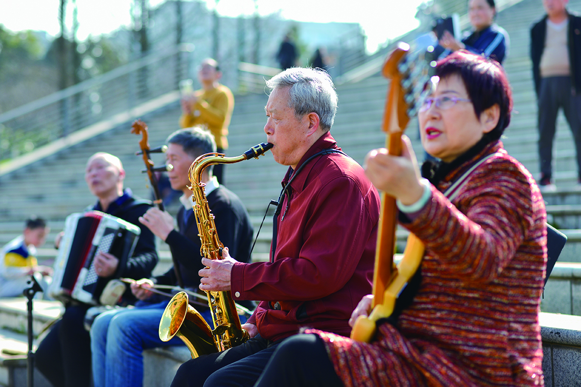 初二,钢琴广场几位老人用西洋和民族乐器合奏庆节。 伍海涛 摄