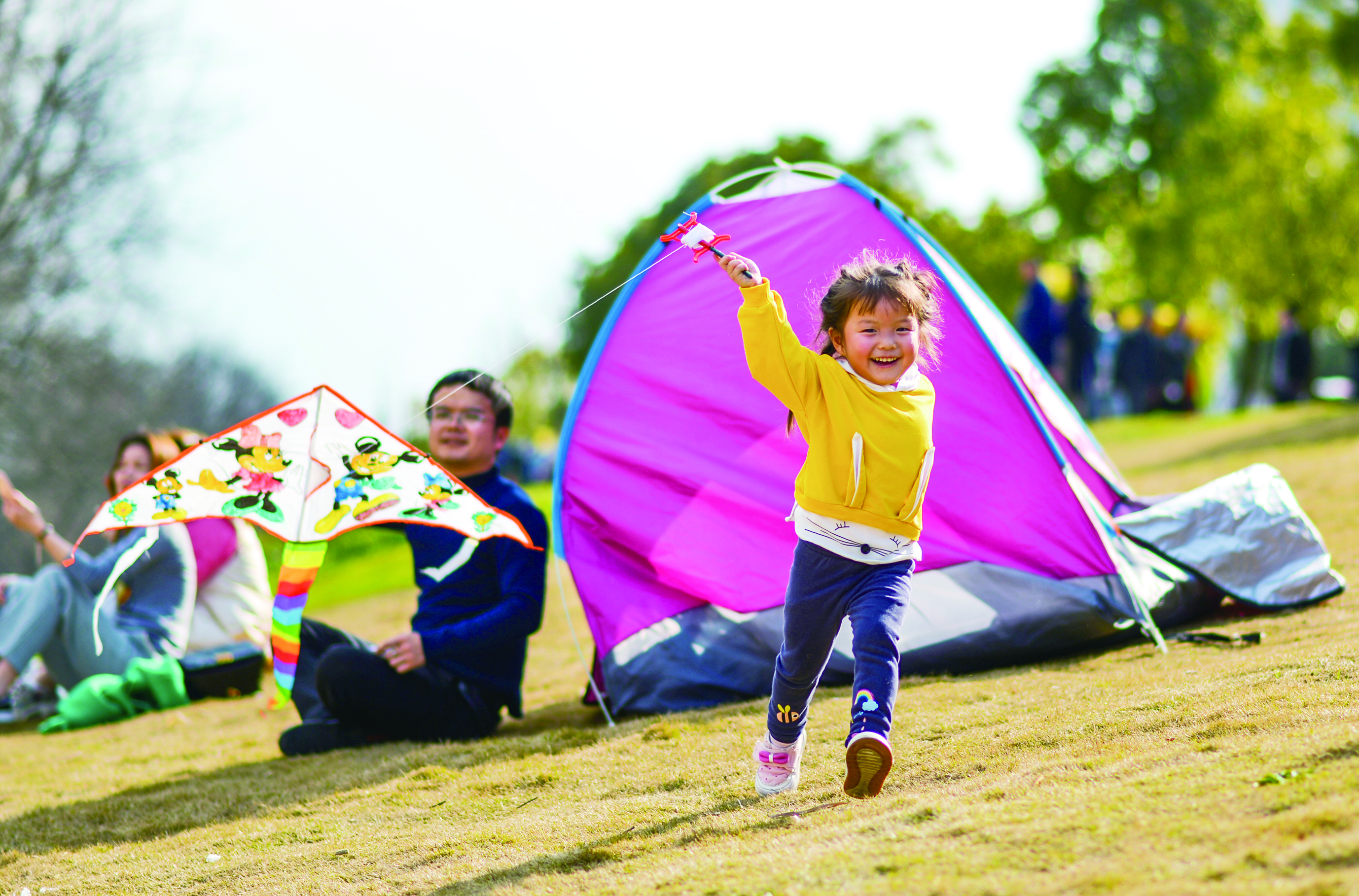 大年初二,天气晴好,孩子在风光带欢快地放着风筝。 伍海涛 摄