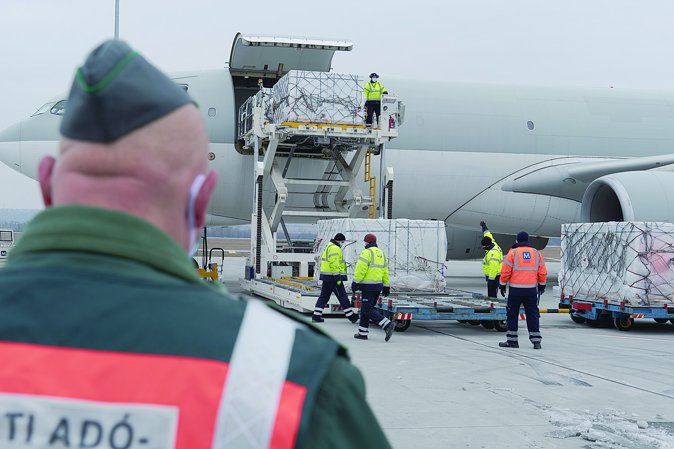 2月16日,在匈牙利首都布达佩斯,机场工作人员卸载中国出口匈牙利的首批新冠疫苗。 新华社发(弗尔季·奥蒂洛 摄)