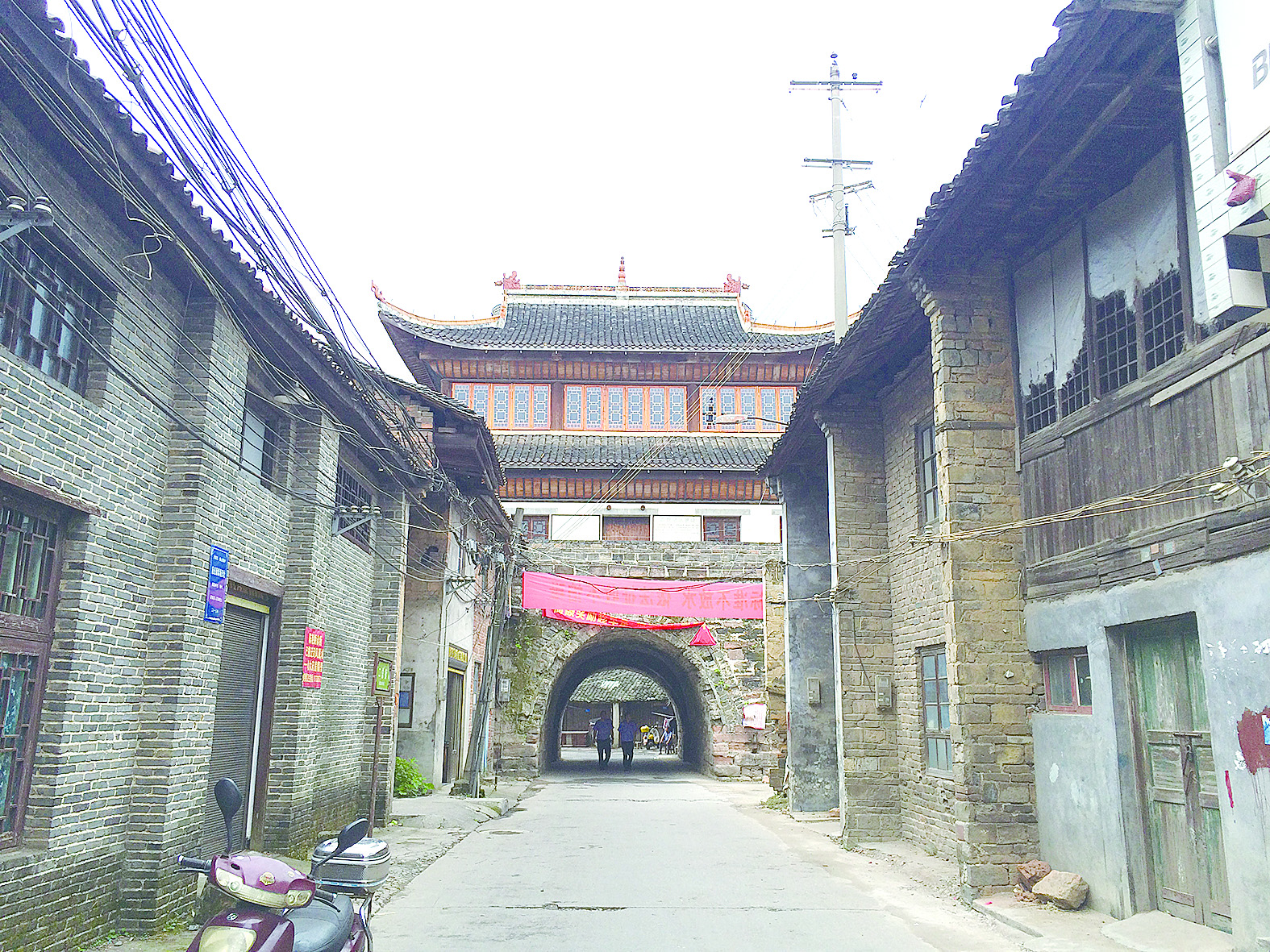这条商道也是古城历史风貌保存最为完好的街道。房子多为单层的土木结构,前店后宅,或前坊后宅。色彩一律为青砖黛瓦粉墙,低垂的屋檐间偶有耸出的马头墙,回廊、檩椽间点缀着花窗,徽派之风、明清之韵十足。墙根长满了青苔,枯了又青,青了又枯,记录着生命的年轮。砖头缝里偶尔探出几棵瘦瘦尖尖的小草,让人感觉到老街的悠久与温润。