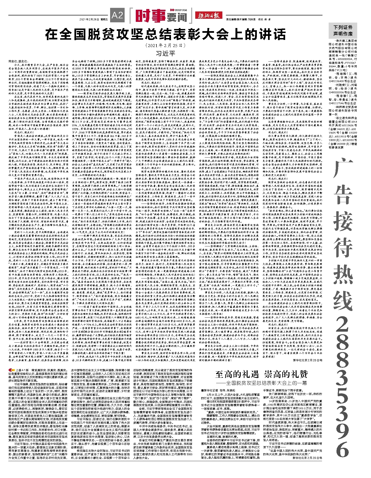 今天,我们隆重召开大会,庄严宣告,经过全党全国各族人民共同努力,在迎来中国共产党成立一百周年的重要时刻,我国脱贫攻坚战取得了全面胜利,现行标准下9899万农村贫困人口全部脱贫,832个贫困县全部摘帽,12.8万个贫困村全部出列,区域性整体贫困得到解决,完成了消除绝对贫困的艰巨任务,创造了又一个彪炳史册的人间奇迹!这是中国人民的伟大光荣,是中国共产党的伟大光荣,是中华民族的伟大光荣!