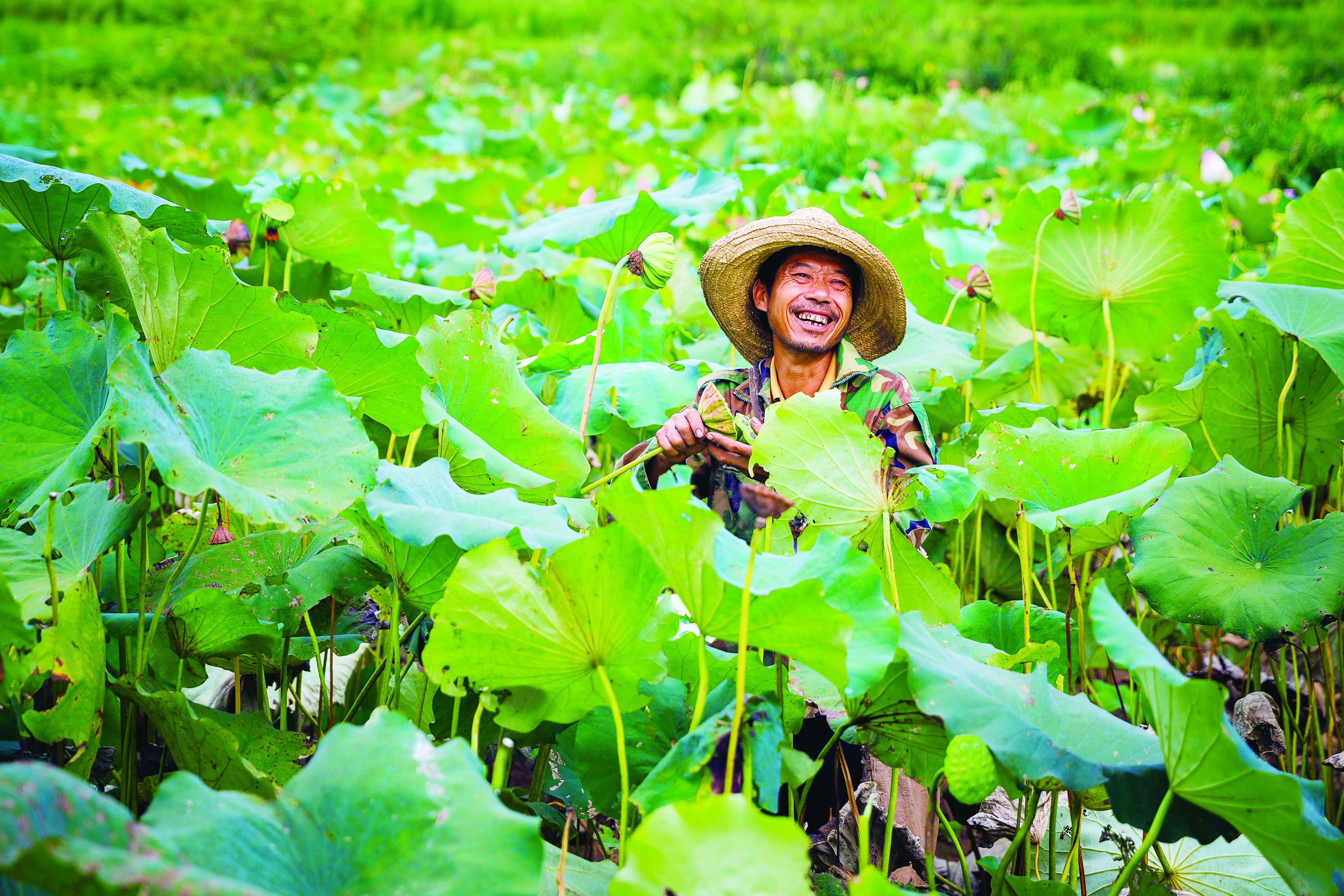 古岳峰镇白壁村千亩莲田喜迎大丰收,脱贫户胡军旗在茂密的莲叶丛中采莲。 汤洪忠 摄