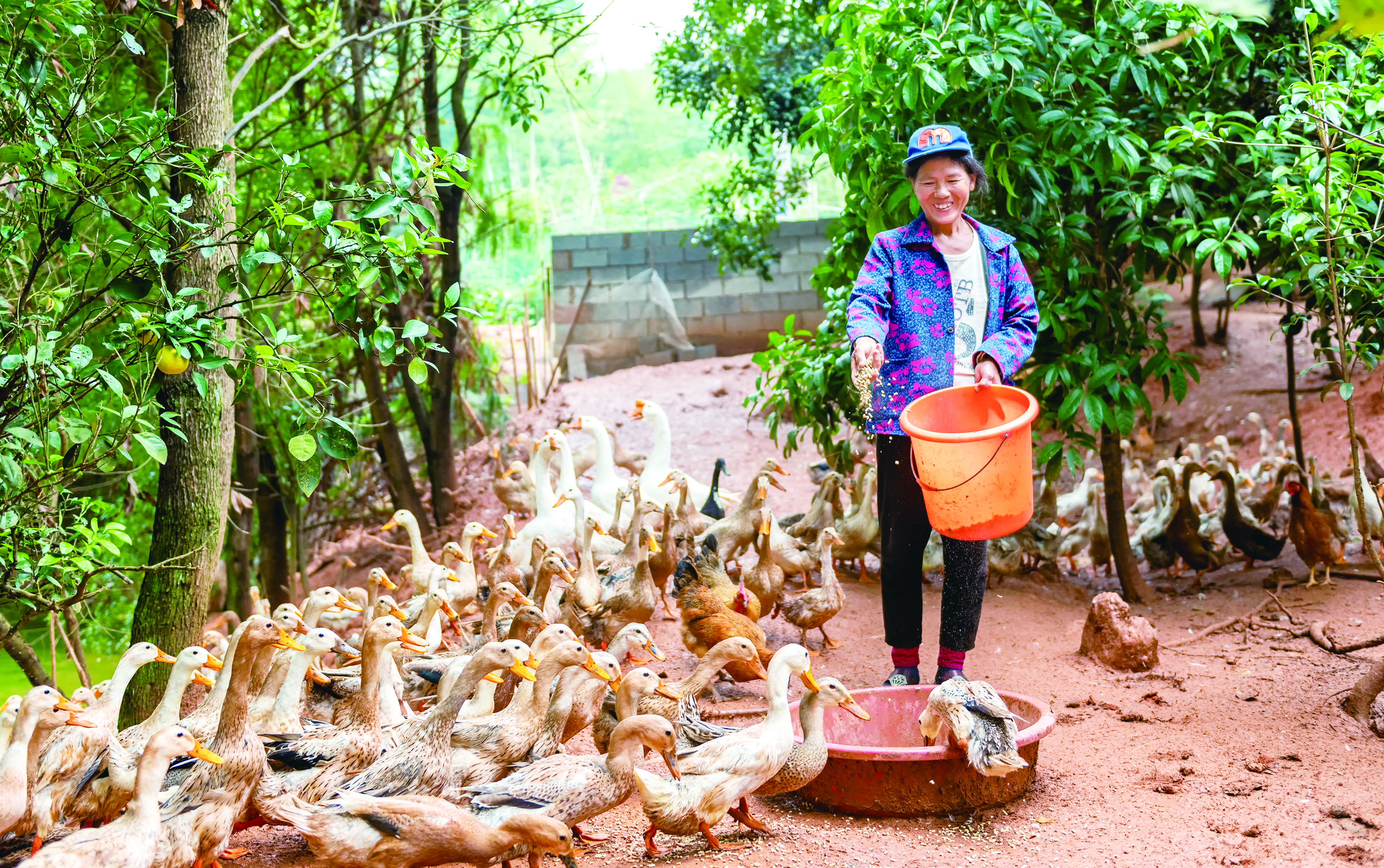 龙船镇梅冲村李元英正在给鸭子喂食,望着即将出栏的鸭子,她的脸上乐开了花。 文禹 摄