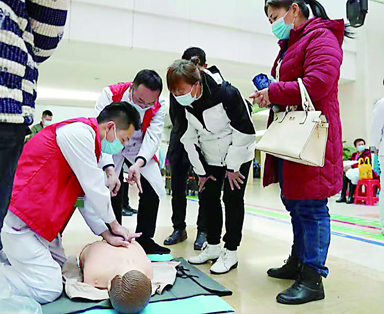 “手臂要绷直加紧,按压的位置在两乳头连线的中点……”3月5日,在市中心医院,一场主题为“以生命赴使命·用大爱护众生”的公益活动上演。