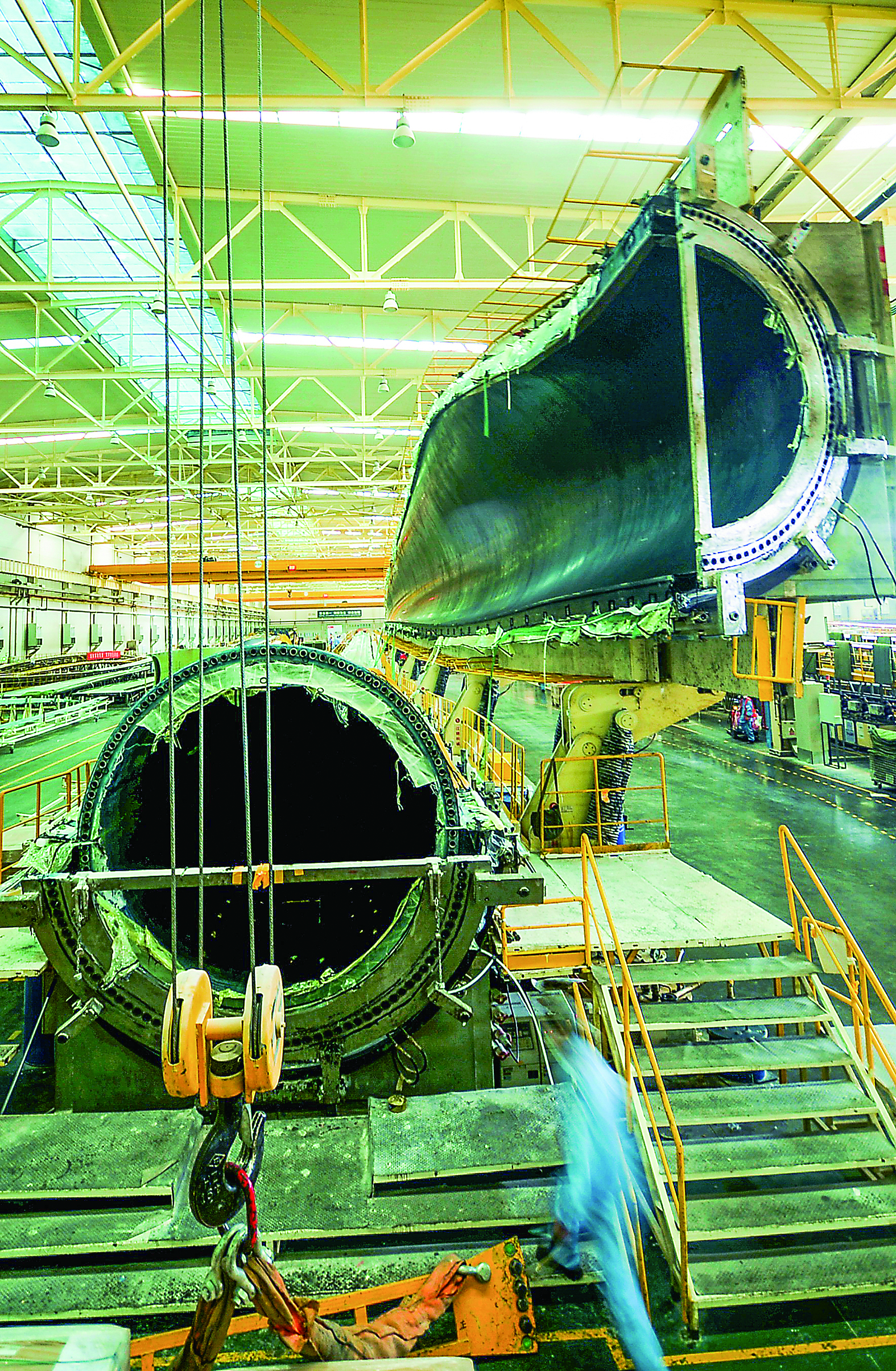 在千帆竞发、百舸争流的湘江西岸,有一个闻名遐迩的“株洲·中国动力谷”。2017年5月,一个全新的南方风电叶片生产基地——时代新材动力谷厂在这里拔地而起。这是一家绿色能源企业,主要生产不同类型的风电叶片,有职工1200多人,年产值约15亿元。