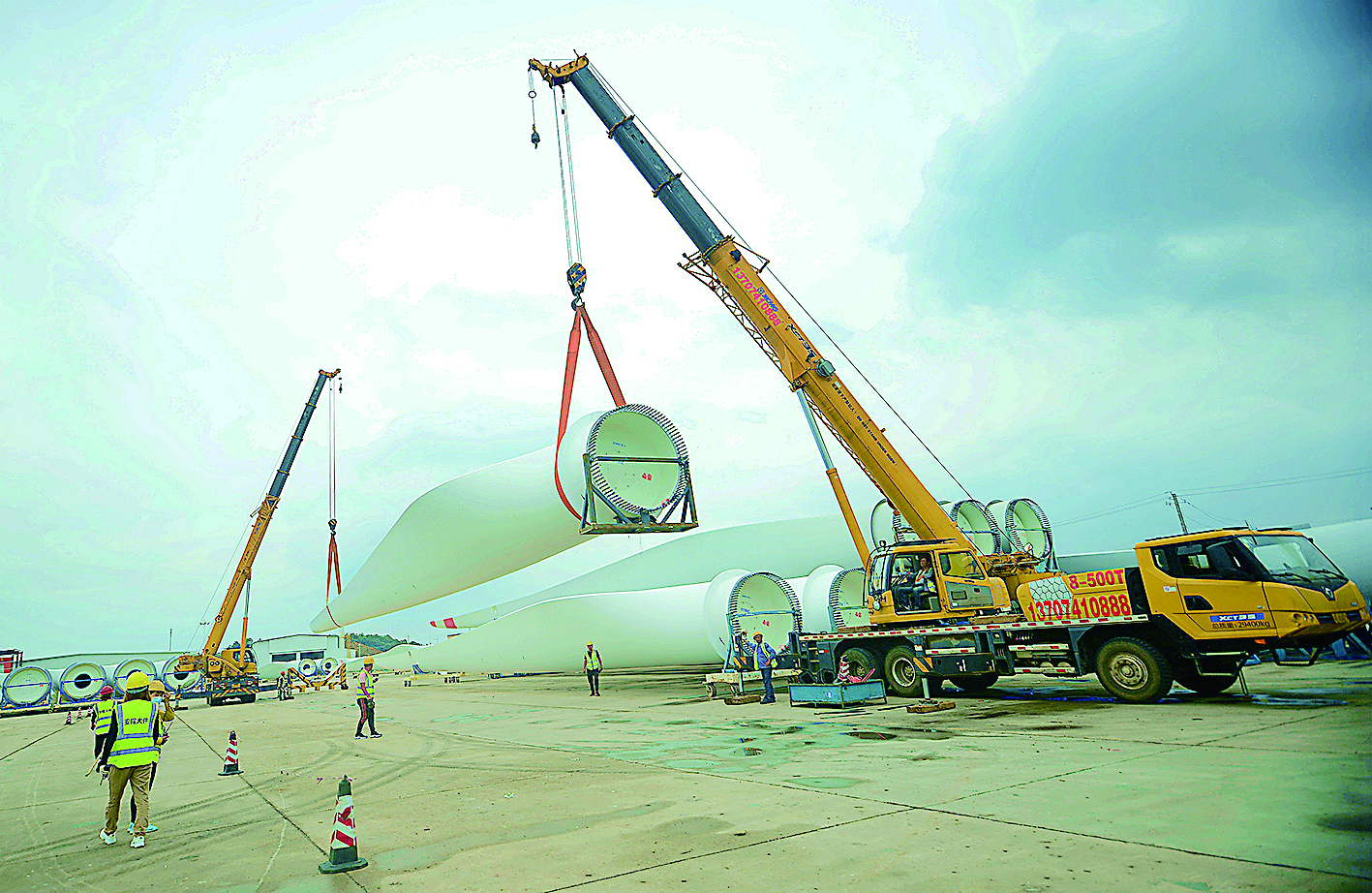 场外吊运班的工人在吊装风电叶片。他们需同时动用2台吊车,才能把这个庞然大物安放到特制的车架上。