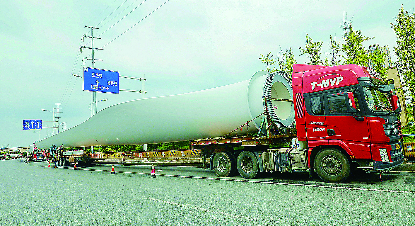 厂门外准备启程的风电叶片运输车队。近的运送至本省有关市州山区,远的要运送到青海、新疆等偏远省区,需耗时一周以上,行程达数千公里。