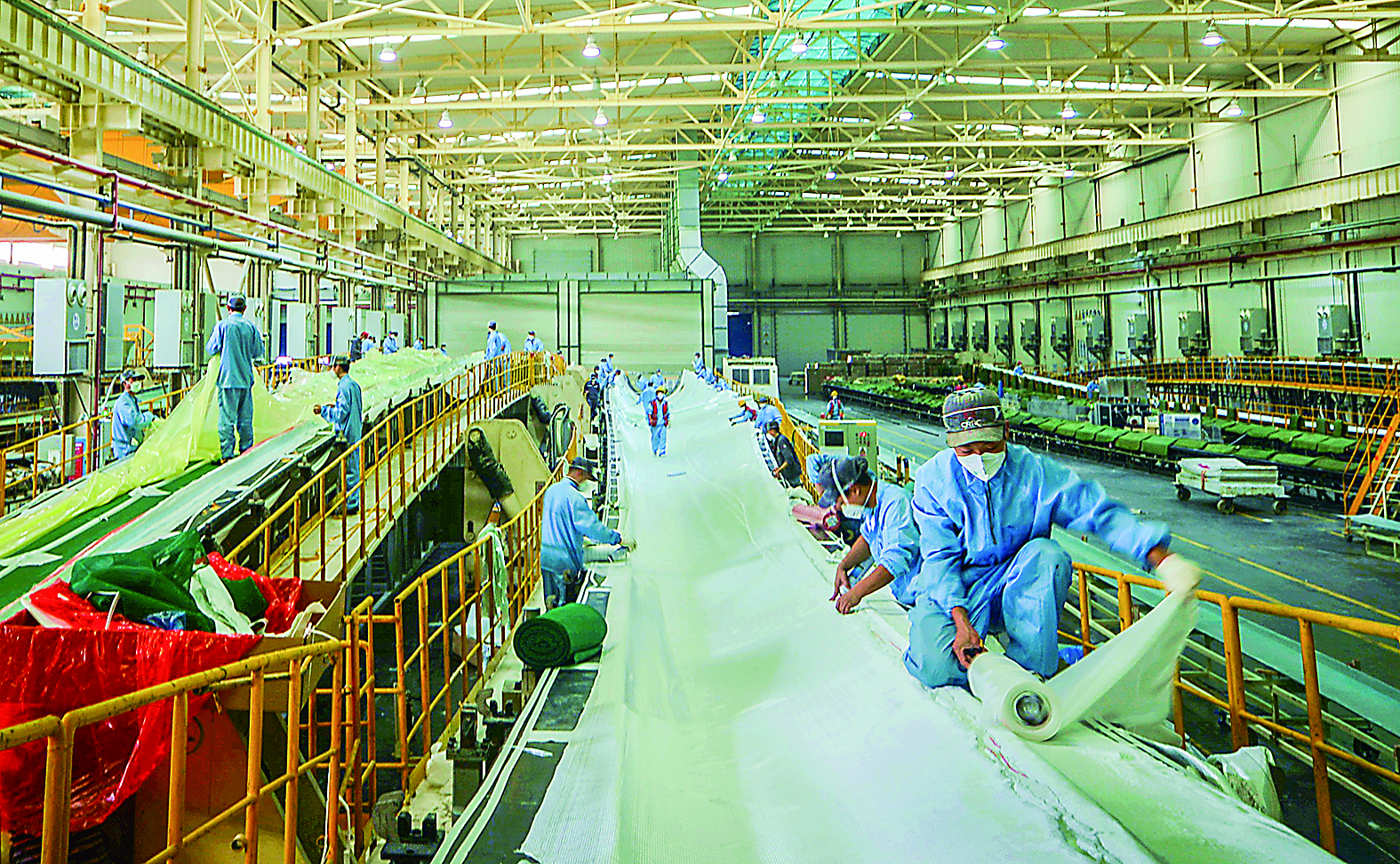 成型车间工人在铺层。制造一支叶片,需要铺设60多层不同的材料,然后才能灌胶成型。
