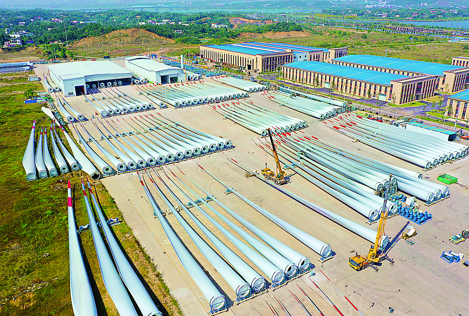 无人机鸟瞰动力谷厂。偌大的堆放场排列着一支支长龙似的叶片,散发着银色的光晕。 易卫明 摄